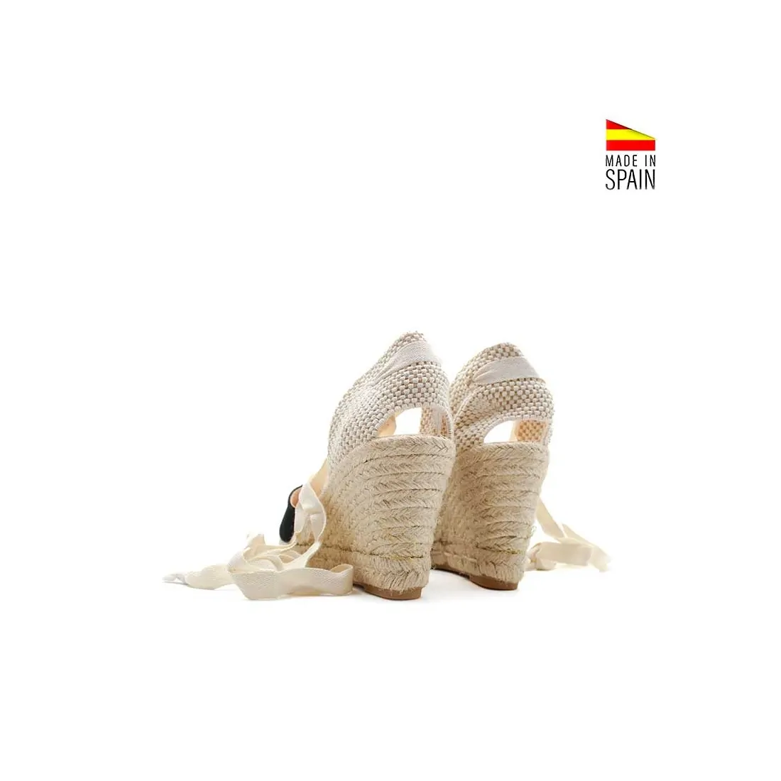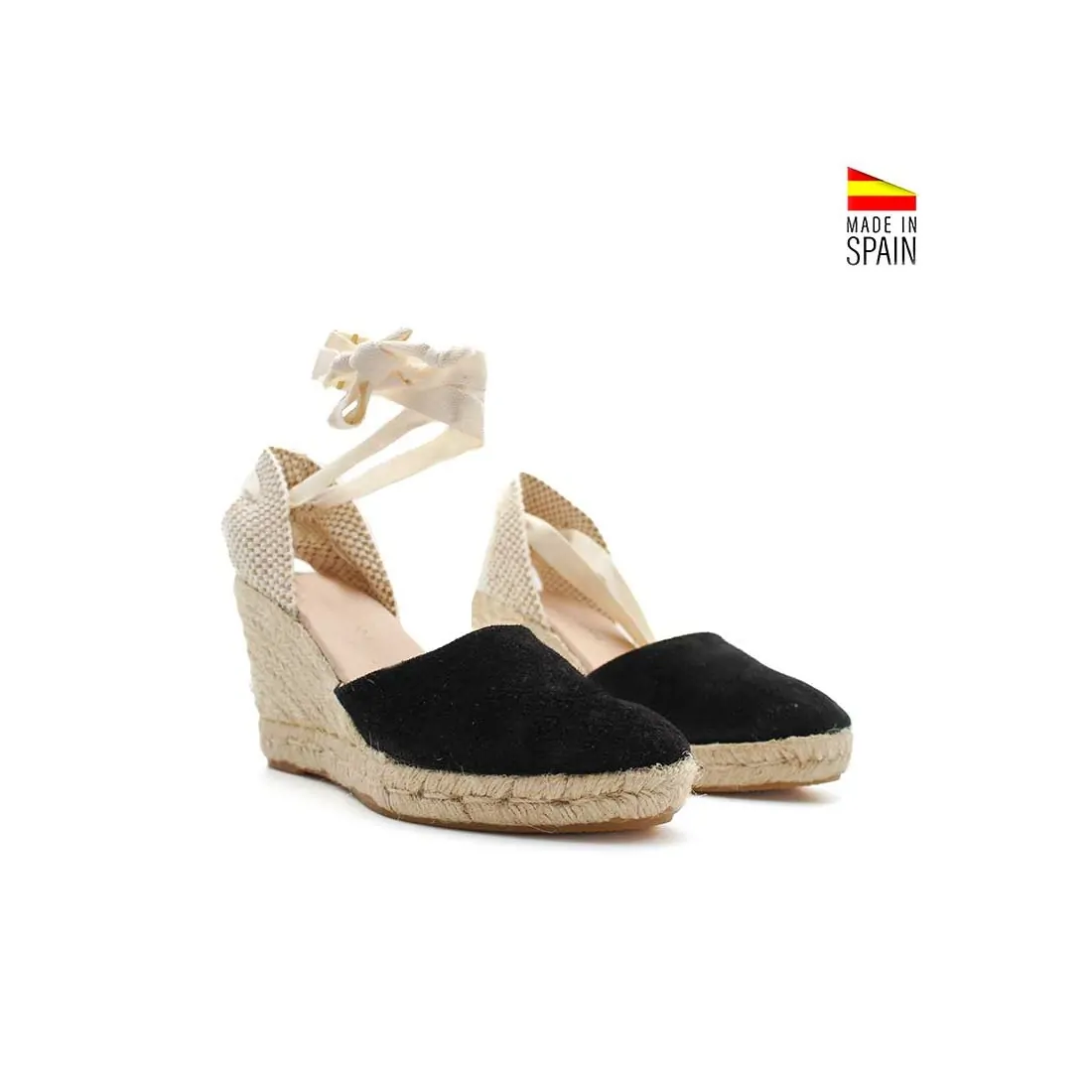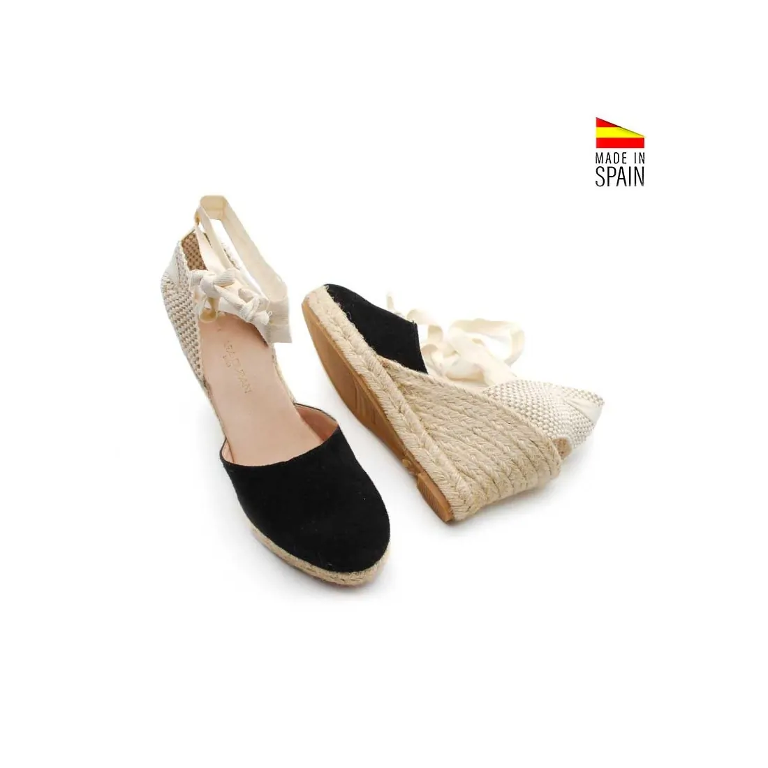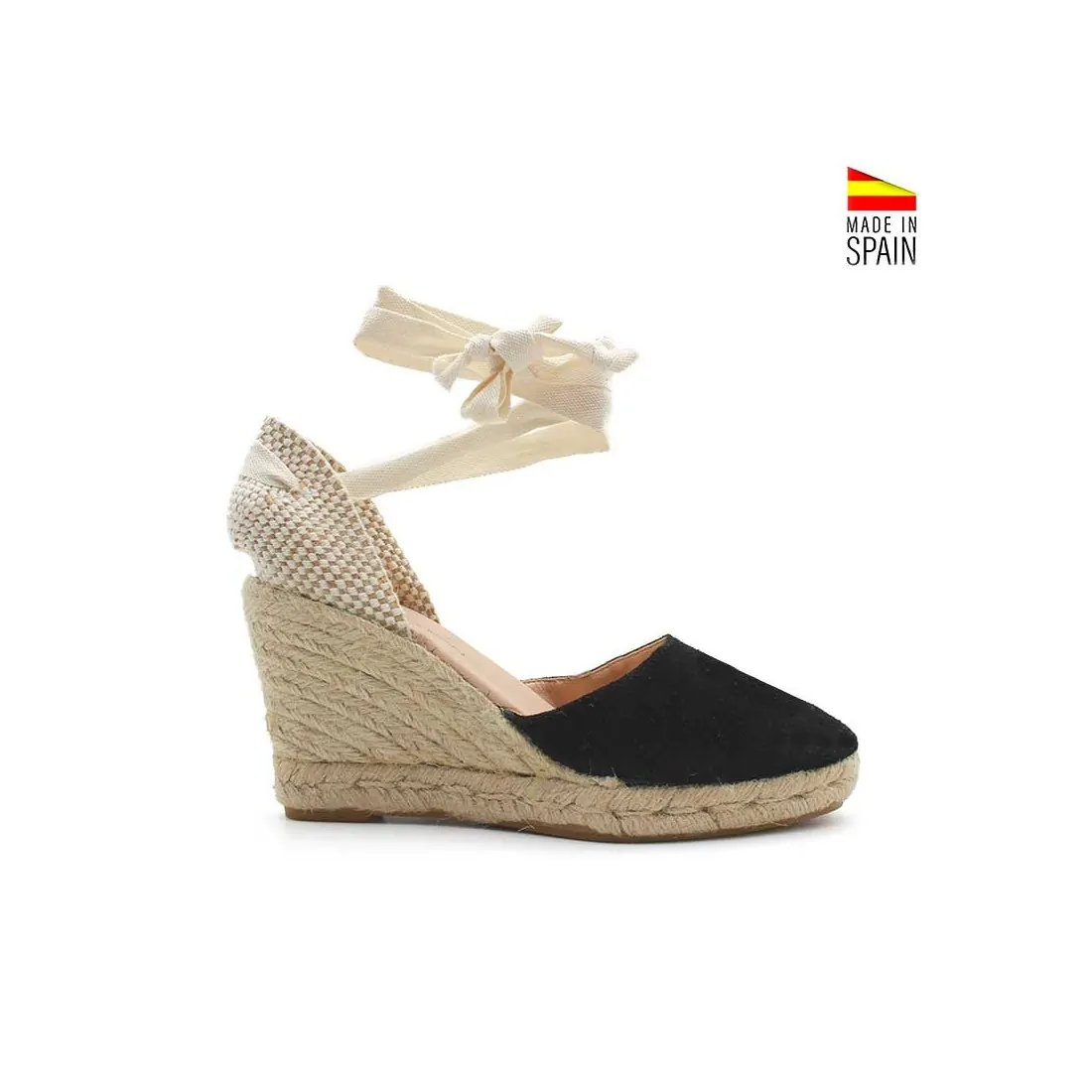 Están confeccionadas en España con piel serraje negra de alta calidad, con una estructura clásica de punta cerrada, talón en tejido trenzado beige y cintas de algodón en color natural para atar al tobillo.