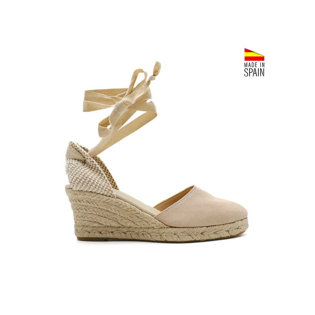Están fabricadas en serraje suave, con cintas al tono para atar al tobillo y una suela de esparto artesanal que aporta ese toque natural y mediterráneo que tanto gusta.