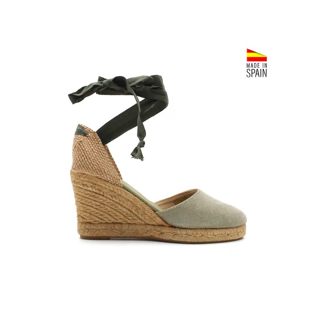 La punta cerrada en serraje verde caqui aporta un acabado elegante y muy ponible, mientras que el cierre de cintas en verde oscuro permite ajustar la alpargata al tobillo con firmeza y sin apretar, además de dar un toque femenino y actual.