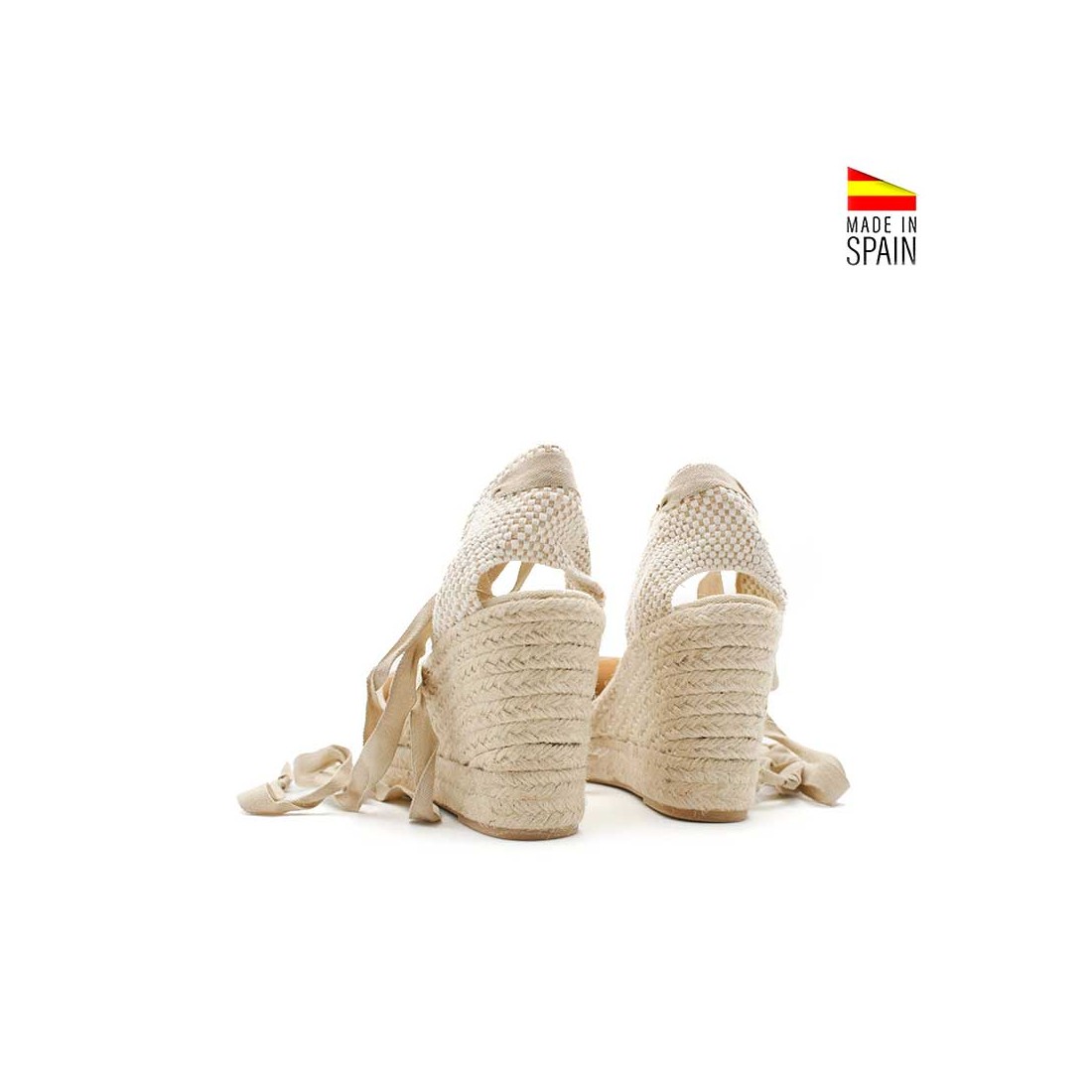 Las cintas para atar permiten un ajuste regulable al tobillo, adaptándose fácilmente a cada pie. Su cuña de 10 cm junto a la plataforma de 2,5 cm de yute ofrece una pisada más elevada, manteniendo un buen equilibrio y estabilidad. La fabricación en España asegura calidad y acabados cuidados.