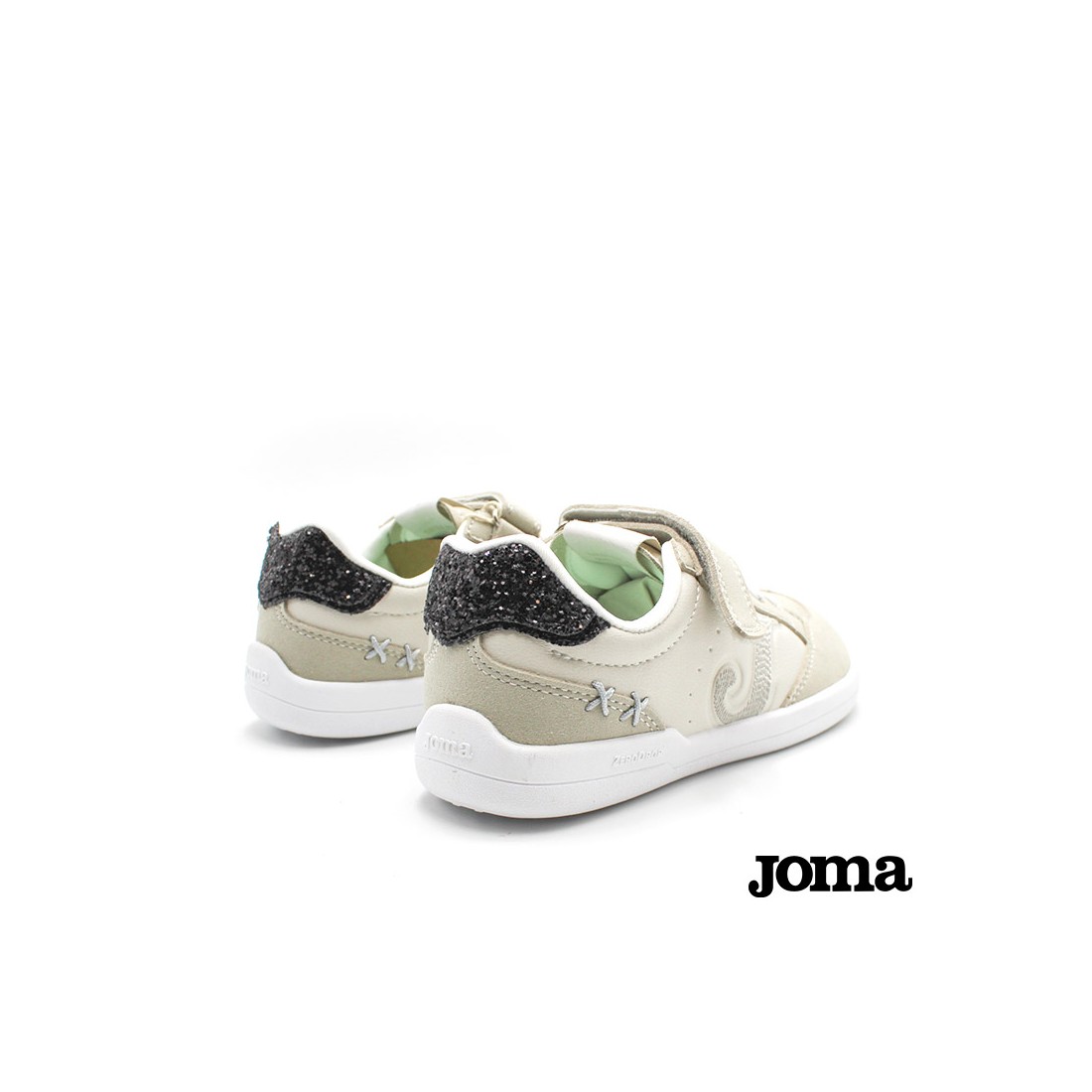 El upper está fabricado en microfibra ligera y transpirable, combinada con zonas de ventilación que mantienen el pie fresco durante todo el día. Además, incorpora detalles decorativos como el talón con acabado brillante de glitter negro, que aporta un toque moderno y atractivo.