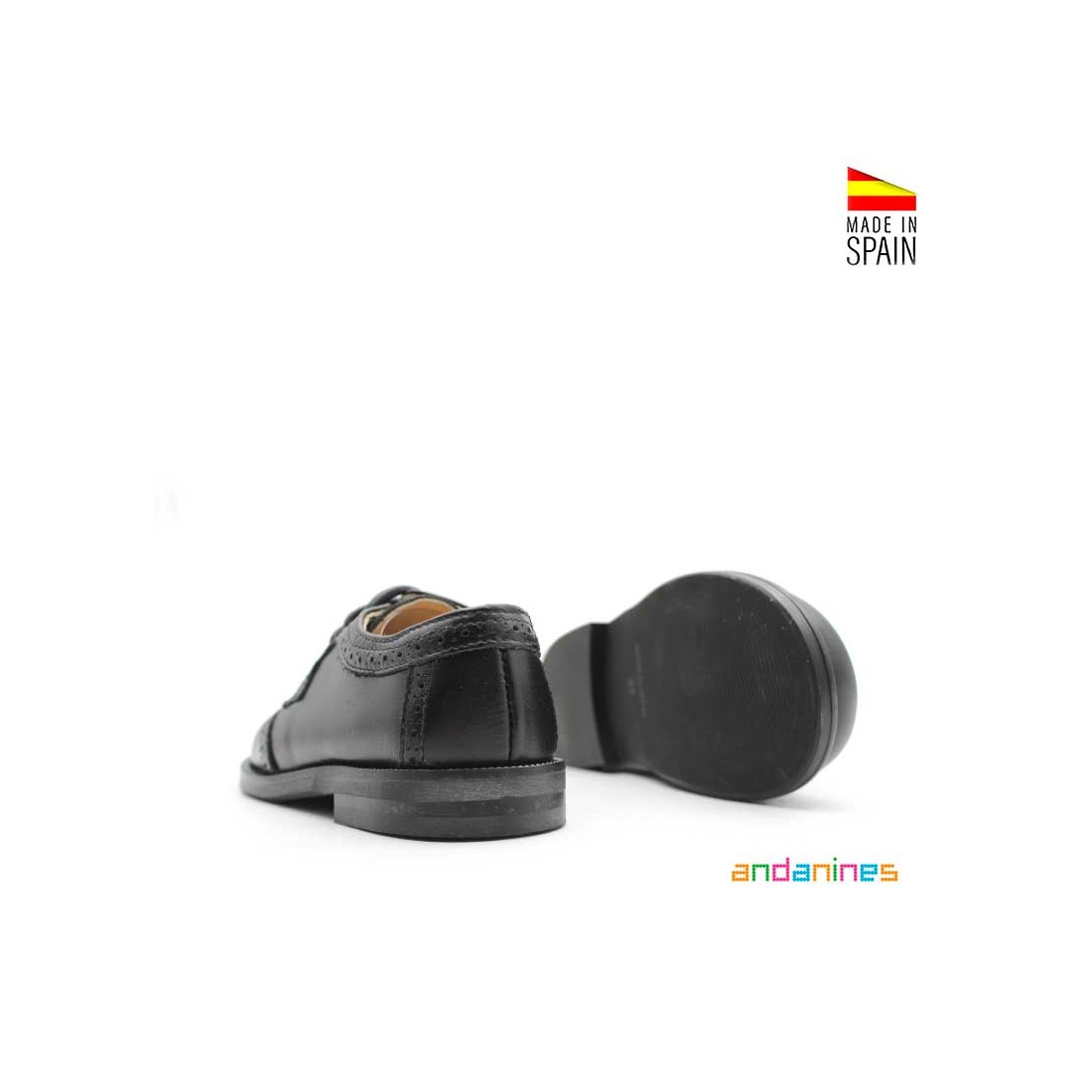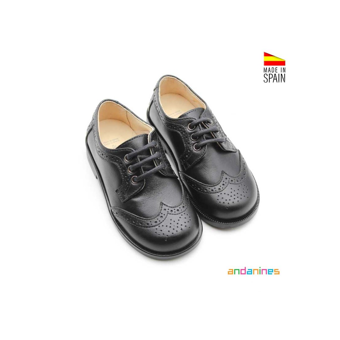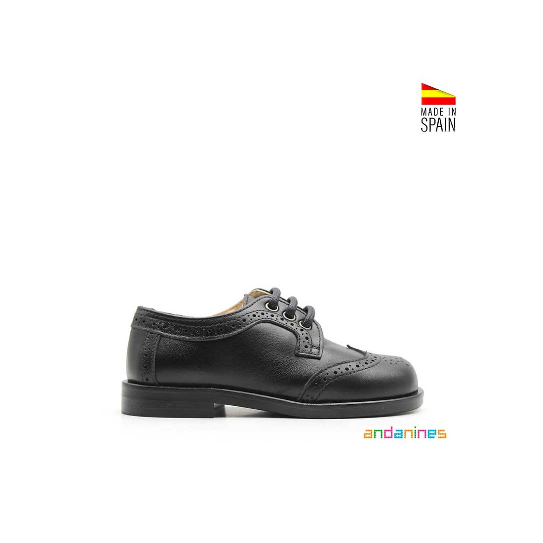 Zapatos infantiles tipo blucher en color negro de Andanines, una apuesta segura para vestir con elegancia y comodidad en cualquier ocasión especial.