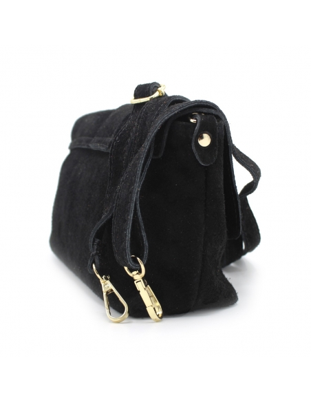 Este modelo en color negro, fabricado en piel serraje, ofrece un diseño rectangular y bandolera que combina a la perfección con cualquier conjunto. La asa larga es regulable para adaptarse a tus preferencias, y los herrajes dorados, incluyendo un círculo dorado distintivo, añadiendo un toque de lujo.