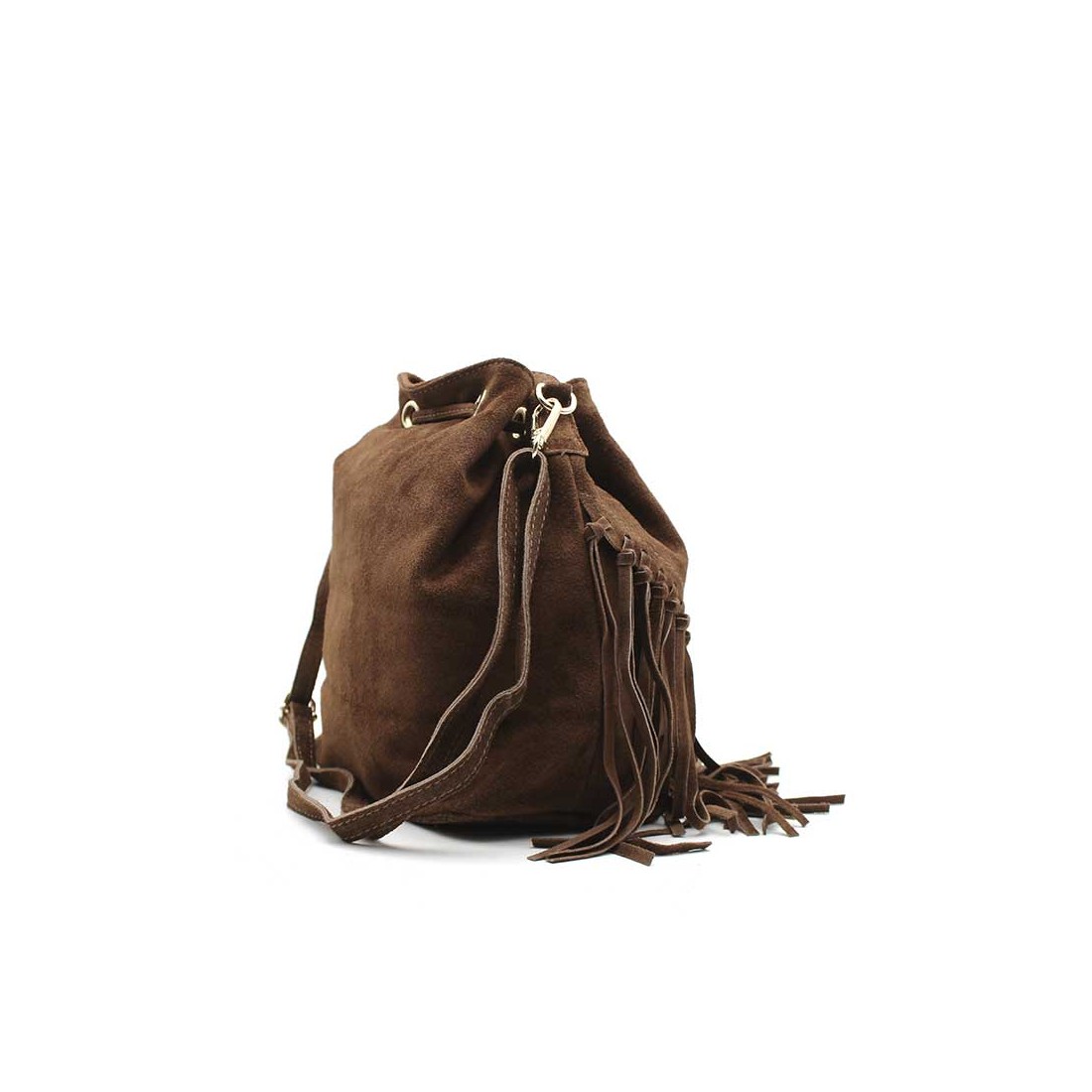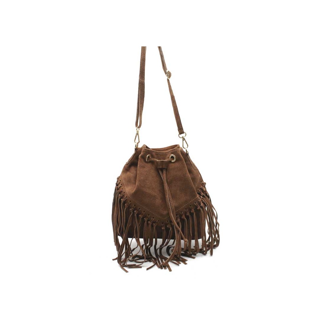 El Bolso Marron Con Flecos estilo saco es el accesorio perfecto para quienes buscan un aire bohemio y moderno en su día a día.