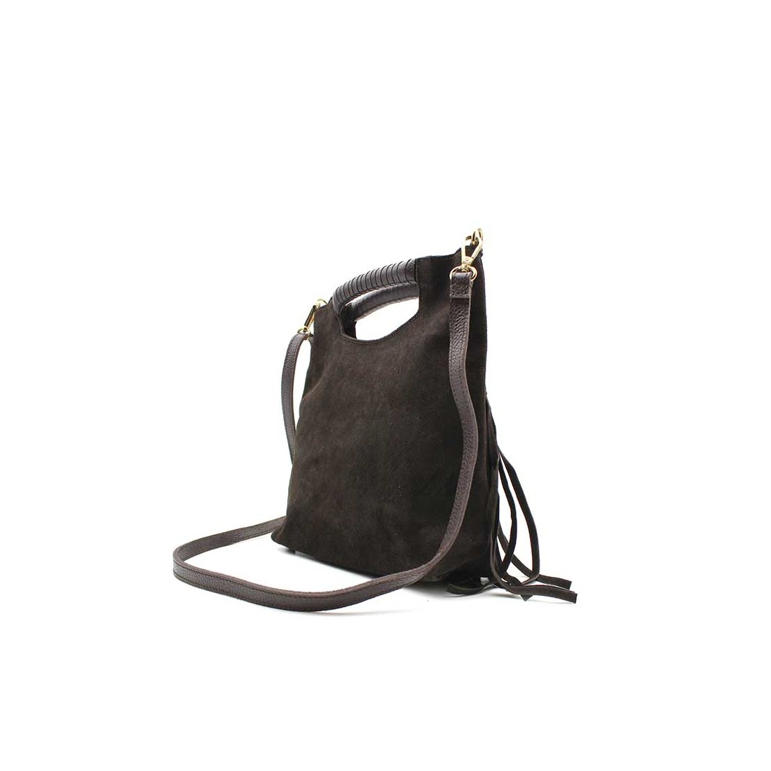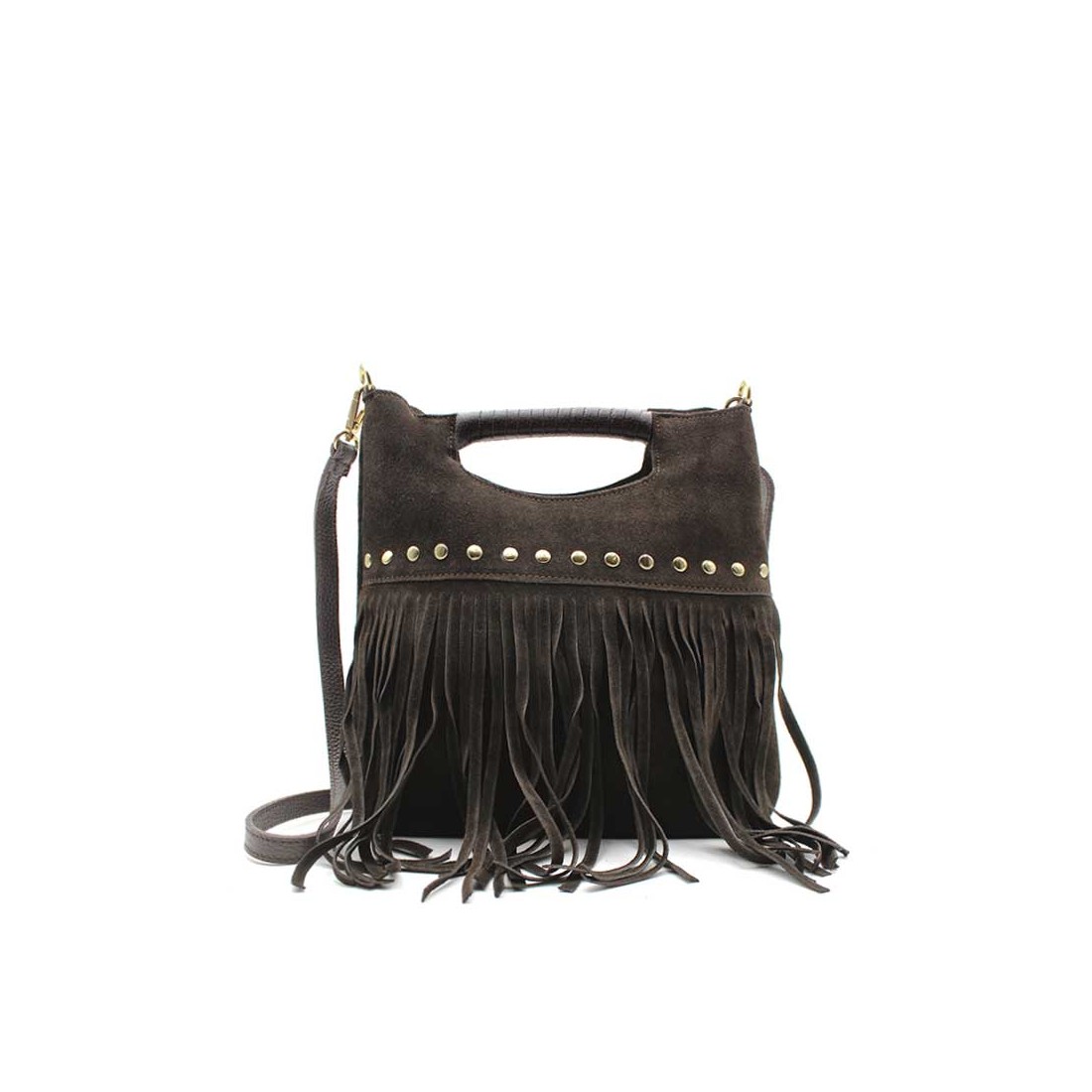 Su diseño en piel serraje de color marrón, el tono más versátil y en tendencia, combina a la perfección con los flecos largos en la parte frontal y una delicada línea de tachuelas doradas, aportando un aire sofisticado dentro del estilo bohemio.