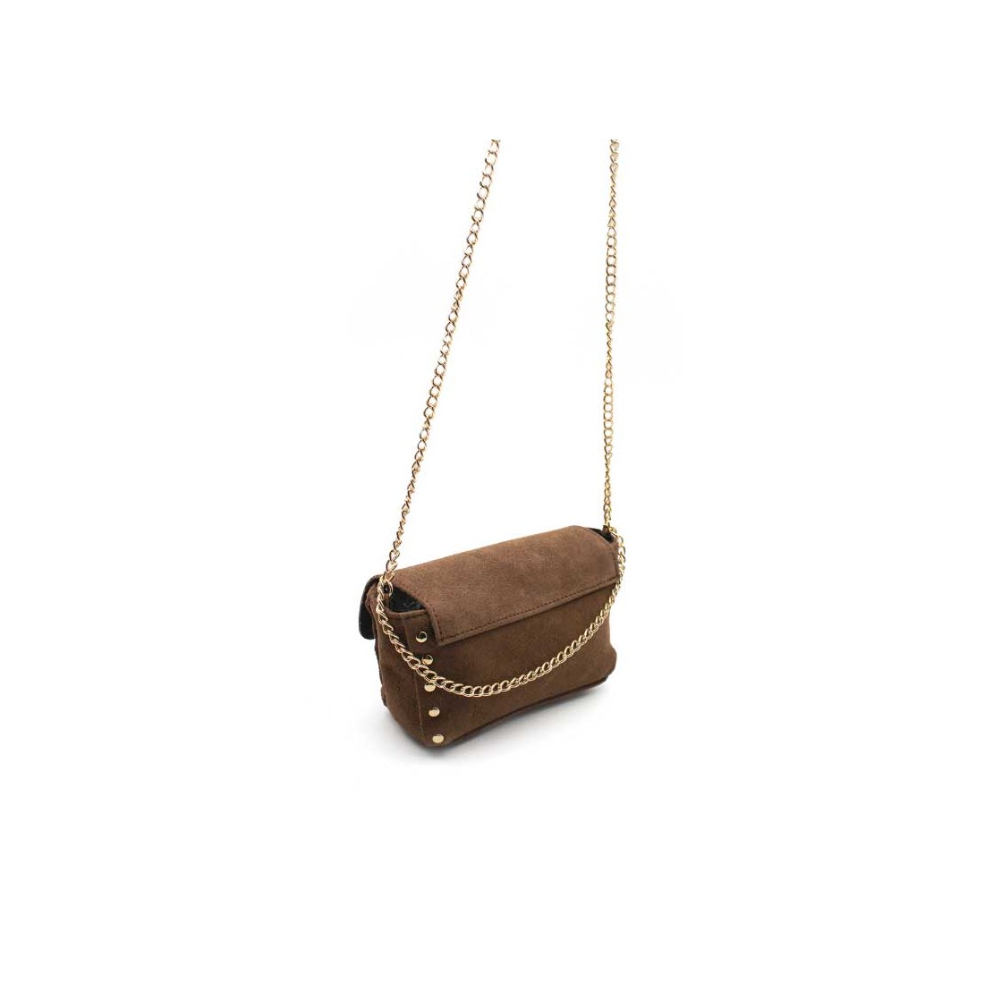 Este mini bolso bandolera marrón combina el encanto del serraje con detalles dorados que aportan elegancia y estilo.