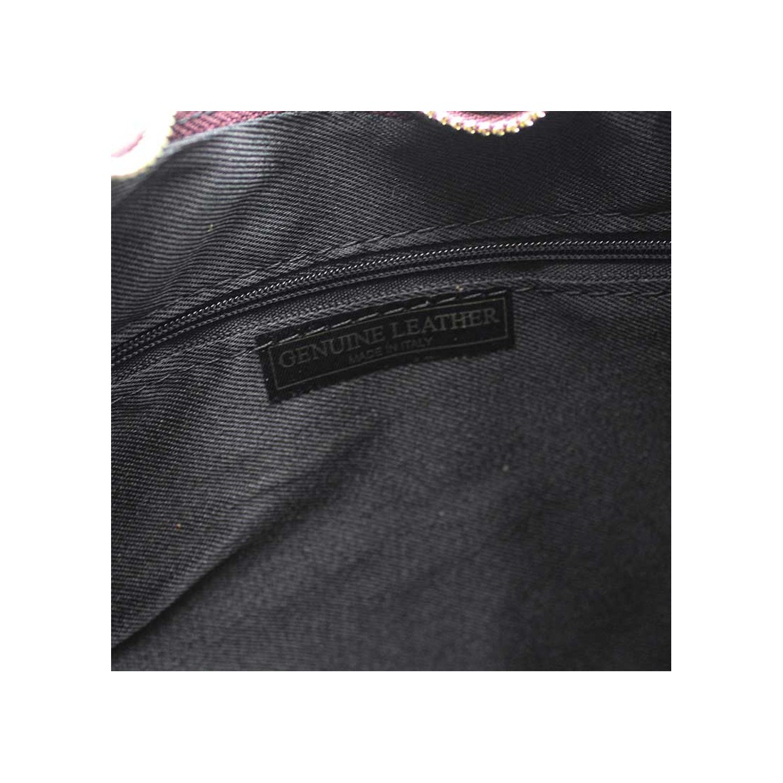 - Exterior: Piel serraje de alta calidad con tachuelas doradas y herrajes metálicos.