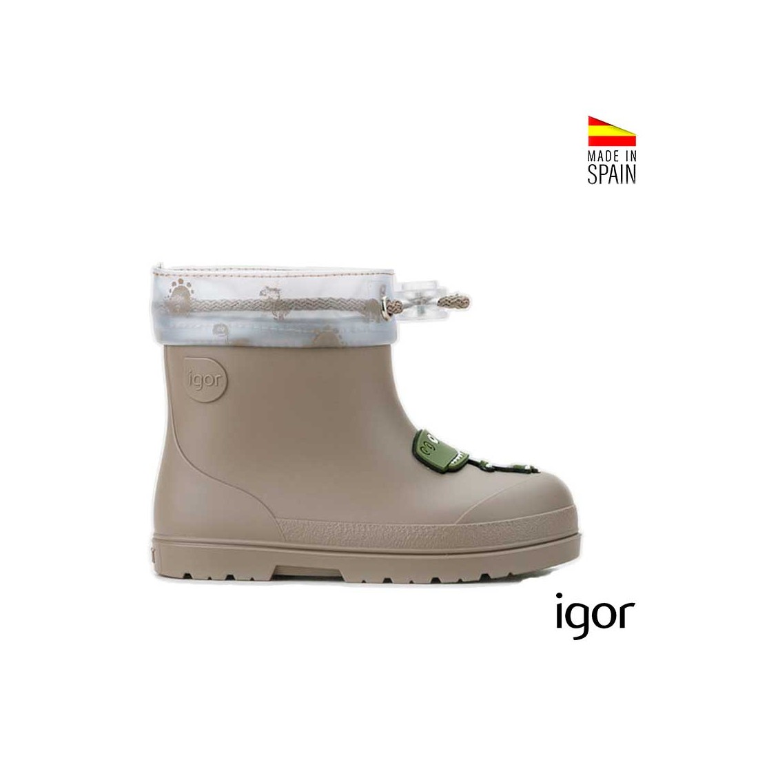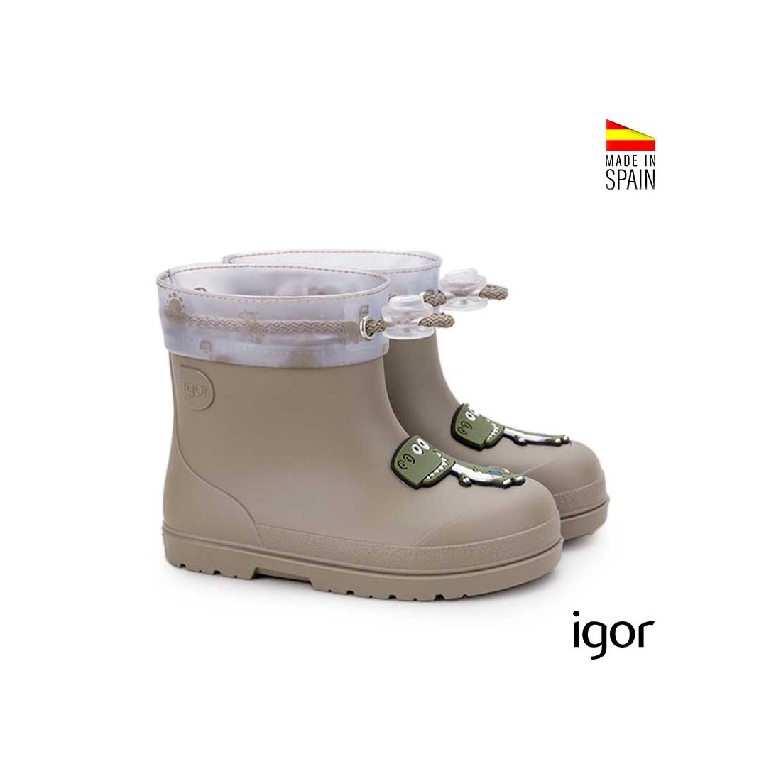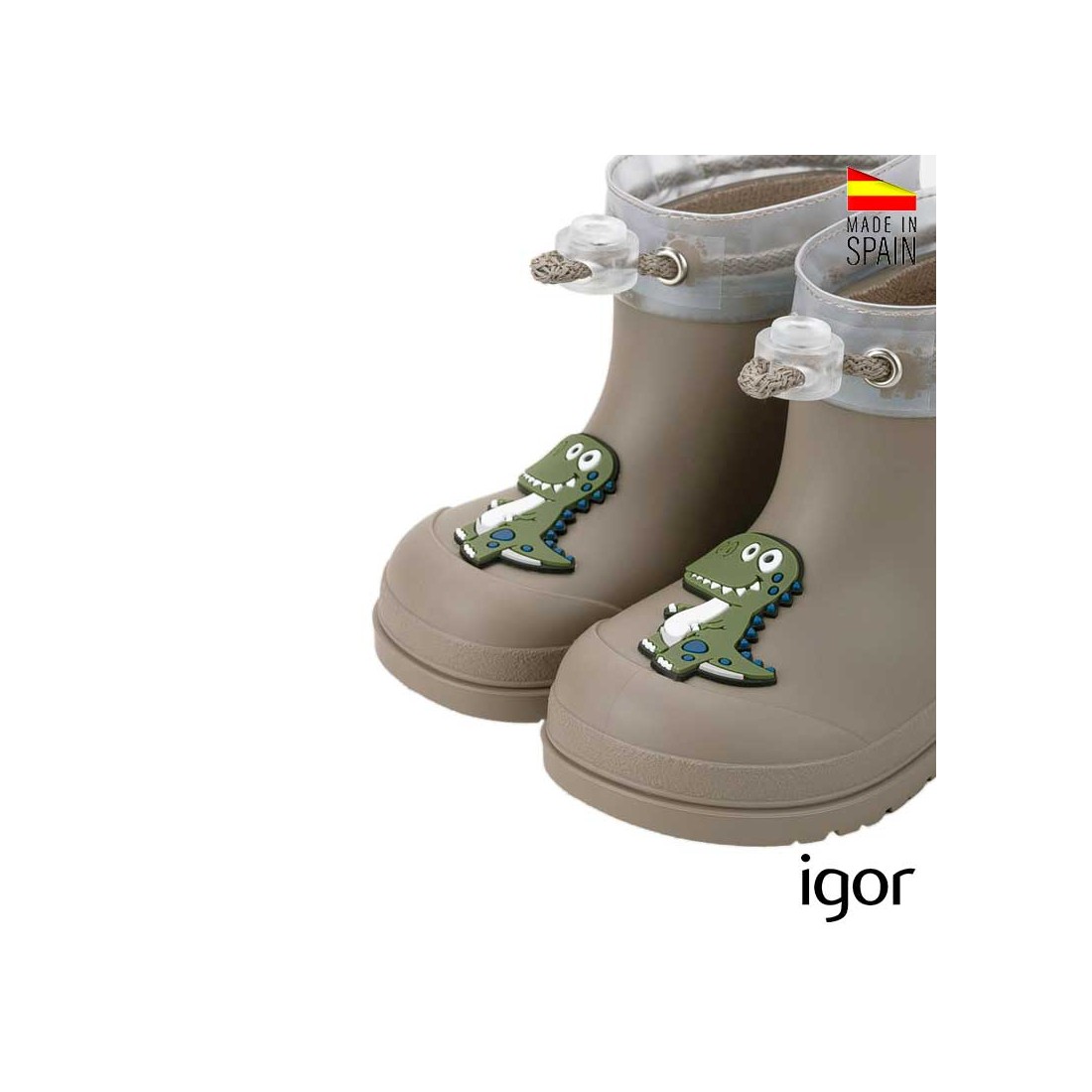 Con un diseño en taupe y un simpático dinosaurio en relieve en el empeine, estas botas están pensadas para pequeños exploradores que disfrutan saltando en charcos sin miedo a mojarse.