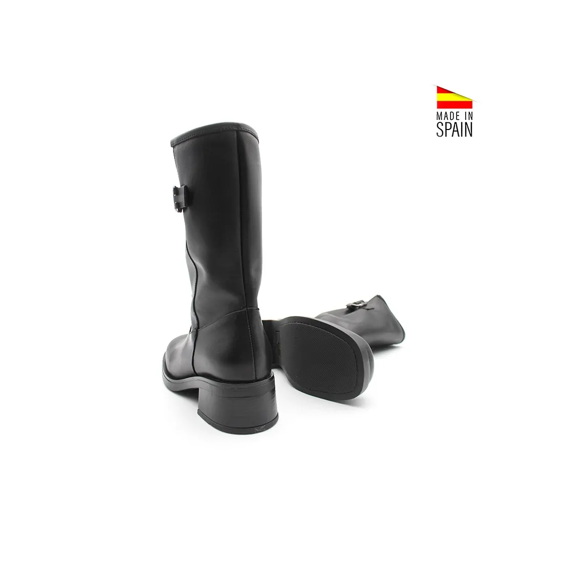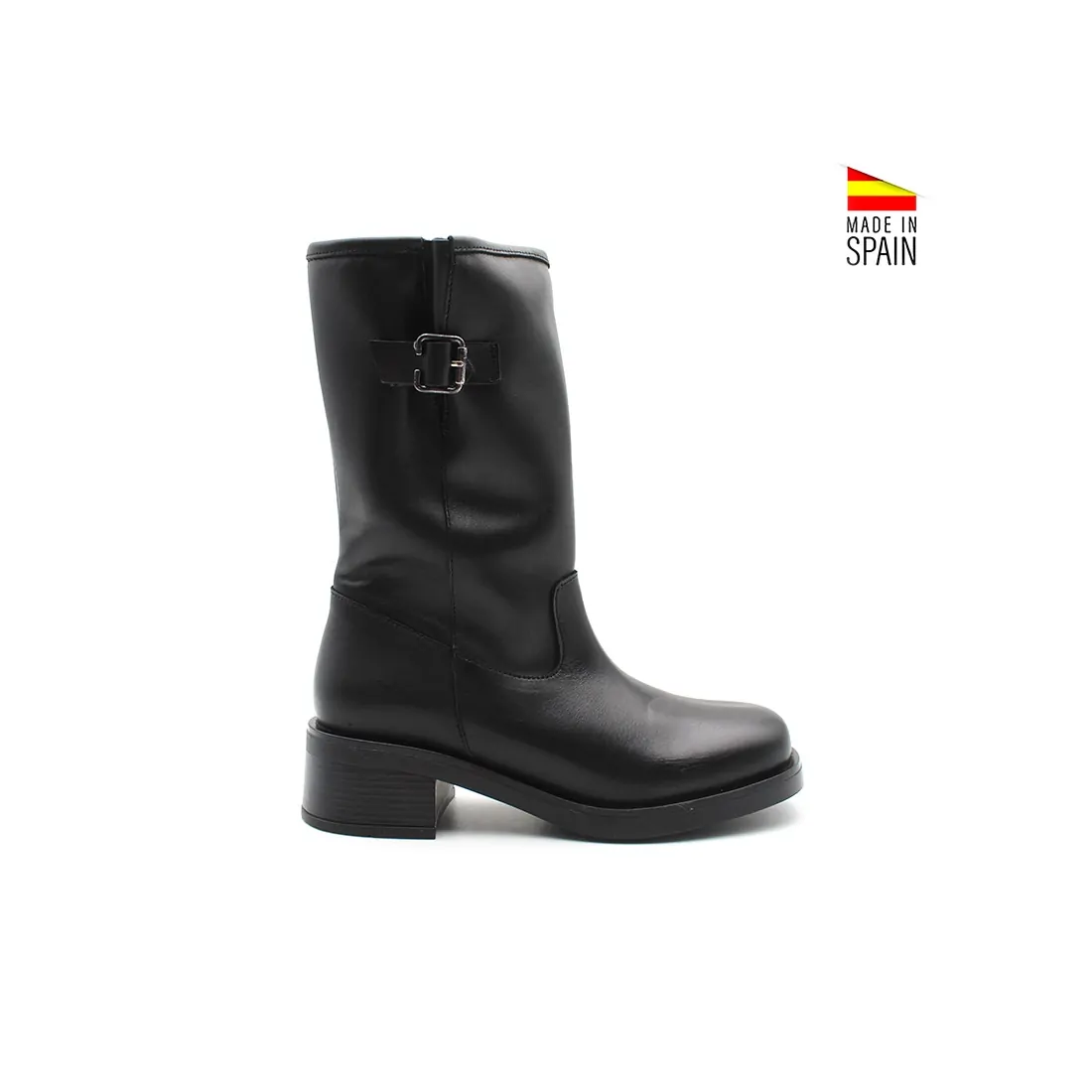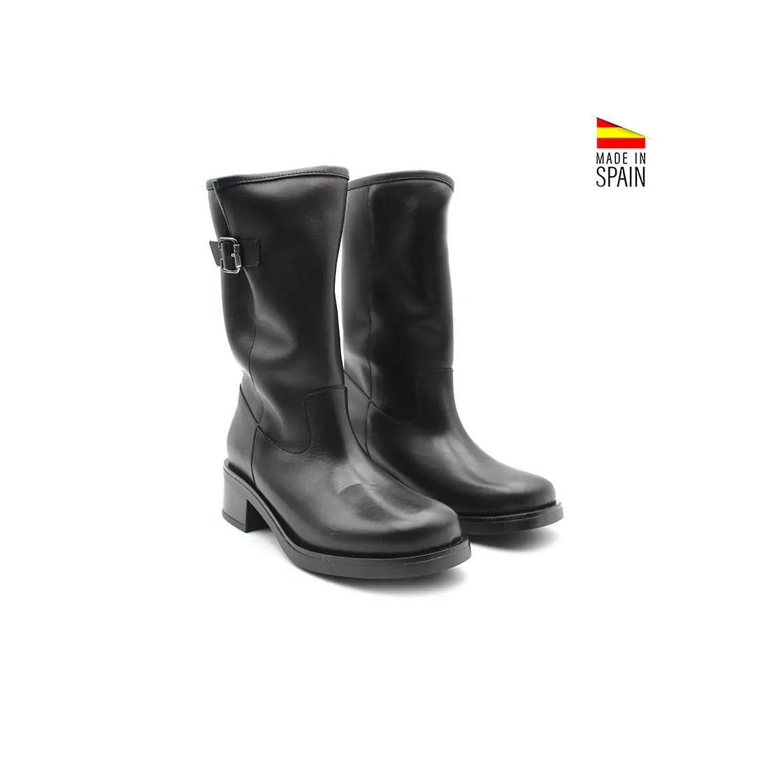 Fabricadas en piel suave de alta calidad, estas botas presentan un diseño inspirado en las botas moteras o biker, pero con un toque más minimalista y elegante. El color negro combina con todo, y la hebilla lateral añade un detalle moderno y ayuda a personalizar el ajuste de la caña.