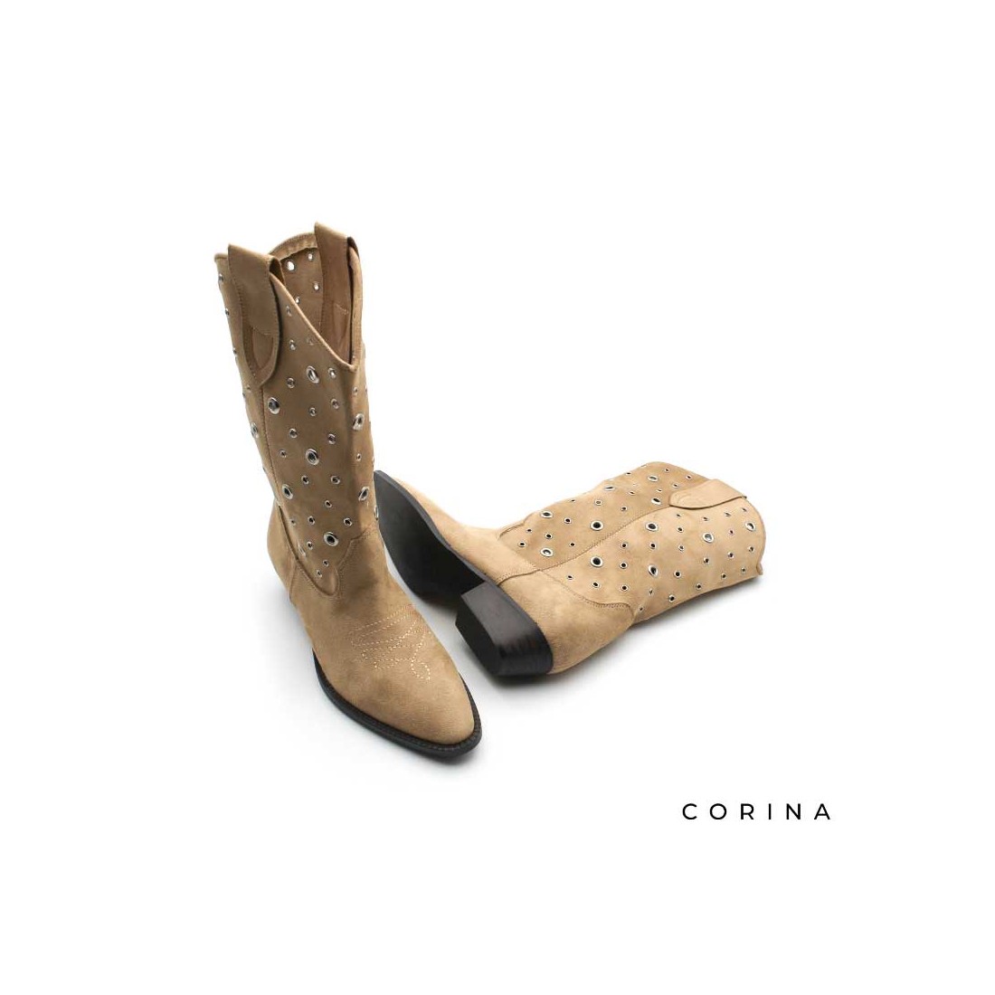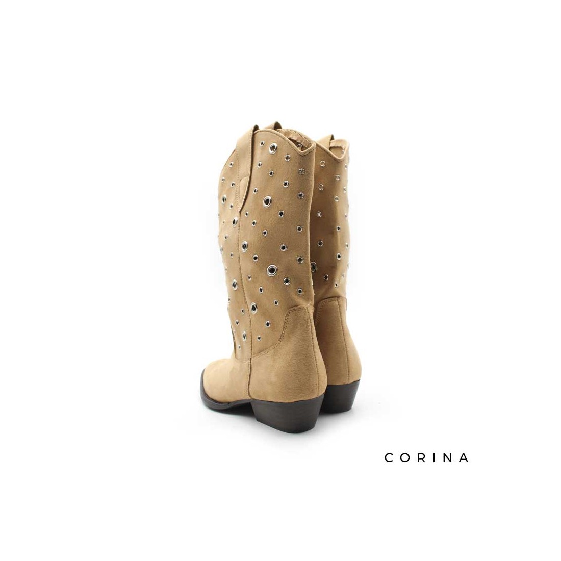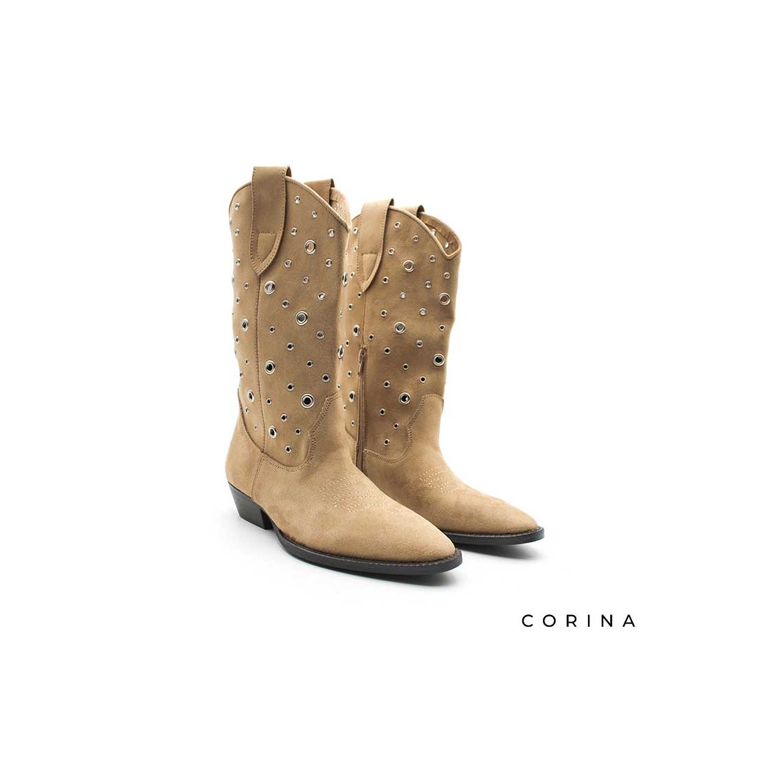 El diseño en color camel de antelina destaca por los ojales metálicos en color plata repartidos por toda la caña de 29 cm de altura aprox., que le dan un aire moderno y cañero sin perder la esencia vaquera.