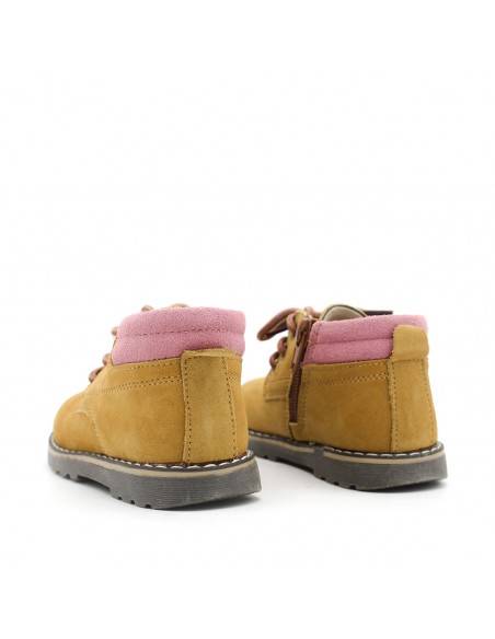 Disponible en tallas 22 a 28, este botín de estilo montaña destaca en color panamá melocotón con un toque de elegancia en el tobillo acolchado de color rosa. El cierre de cordones y la cremallera lateral brindan practicidad y ajuste seguro.