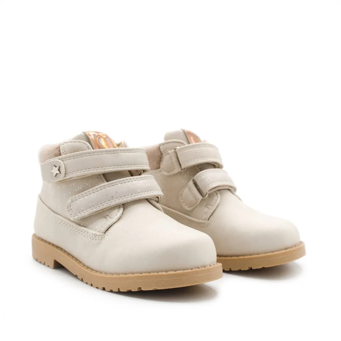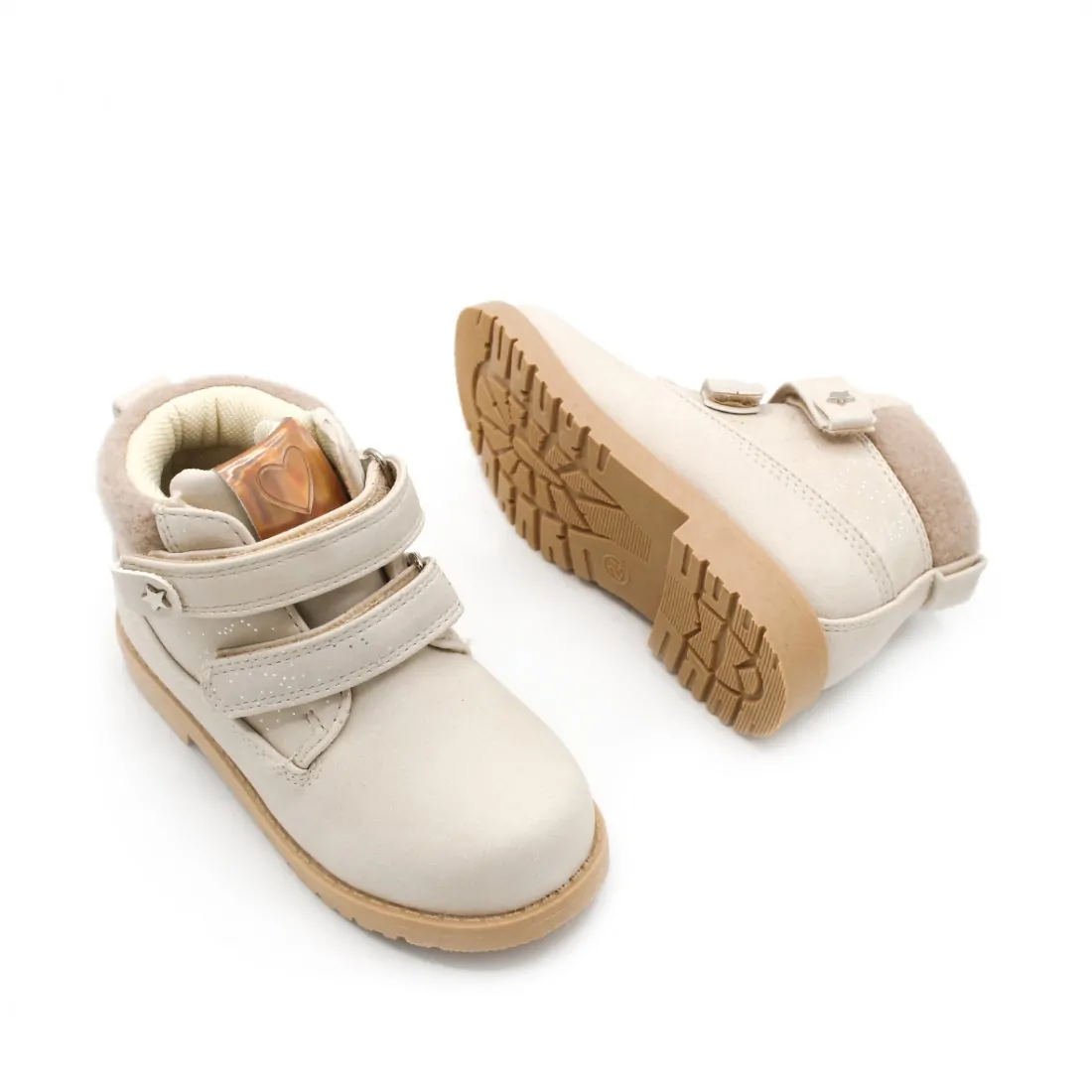 Estos botines, diseñados en un elegante tono beige con detalles plateados metalizados, son una adición imprescindible para cualquier armario de niña. El estilo montaña se combina con un toque de sofisticación, lo que los hace adecuados tanto para ocasiones casuales como para ocasiones más especiales.