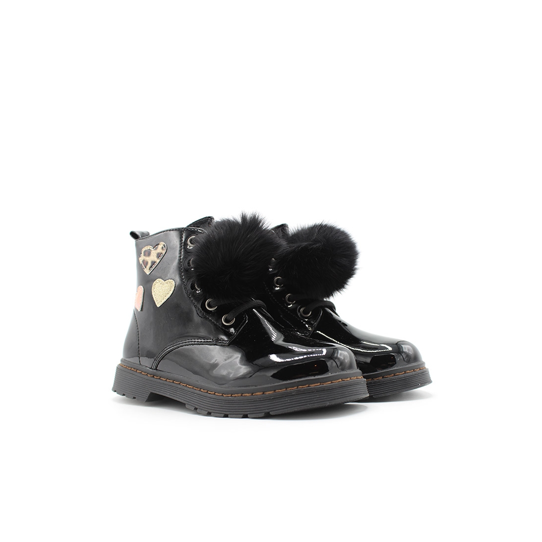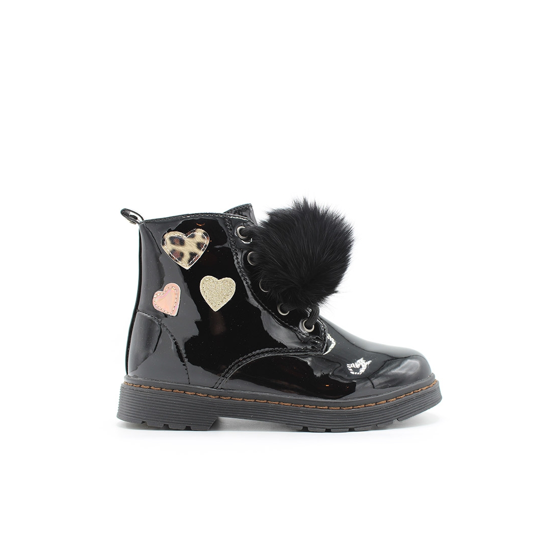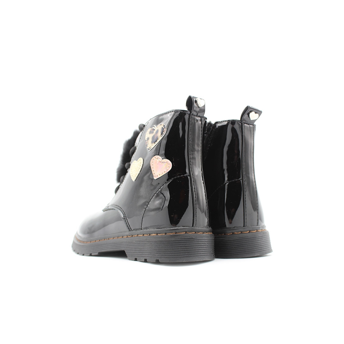 Perfecto para las más atrevidas, su diseño en charol negro con detalles de corazones en diferentes texturas y colores no dejará indiferente a nadie. Además, el pompón de peluche le da un toque extra de dulzura y originalidad que hará que este botín sea el centro de atención en cualquier outfit.