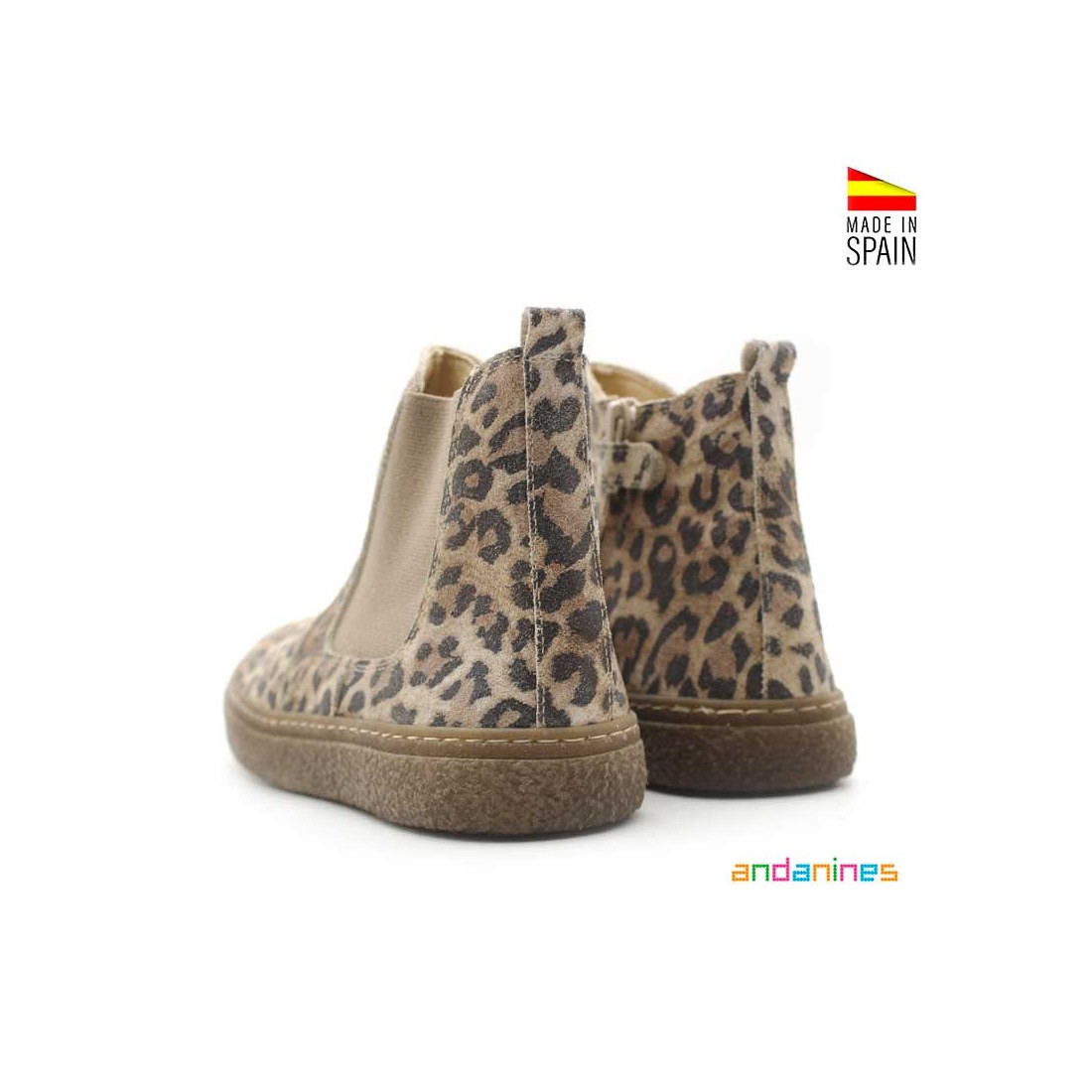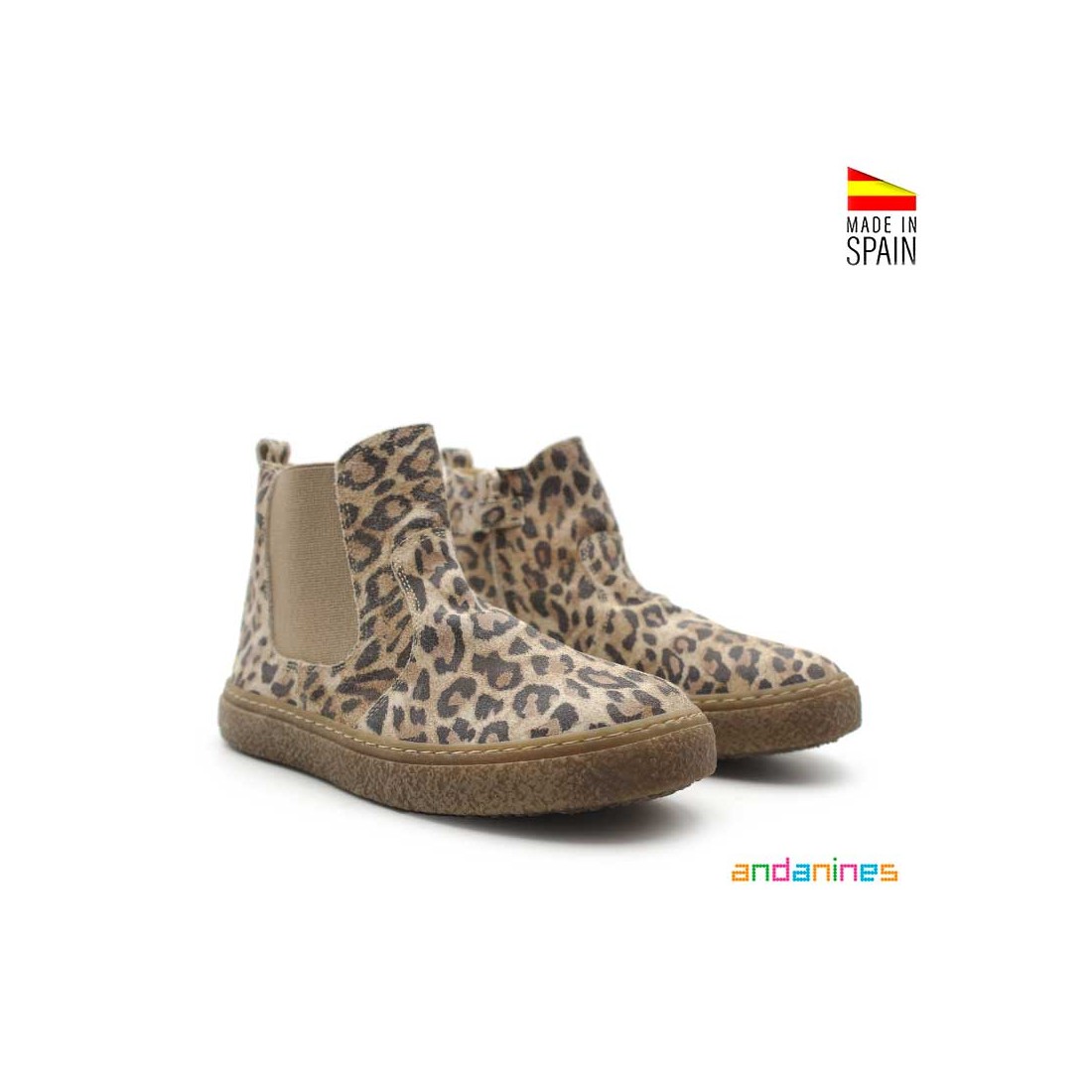 Bota Chelsea Niña en acabado serraje con estampado animal print de leopardo, ideal para combinar con cualquier look de otoño e invierno.