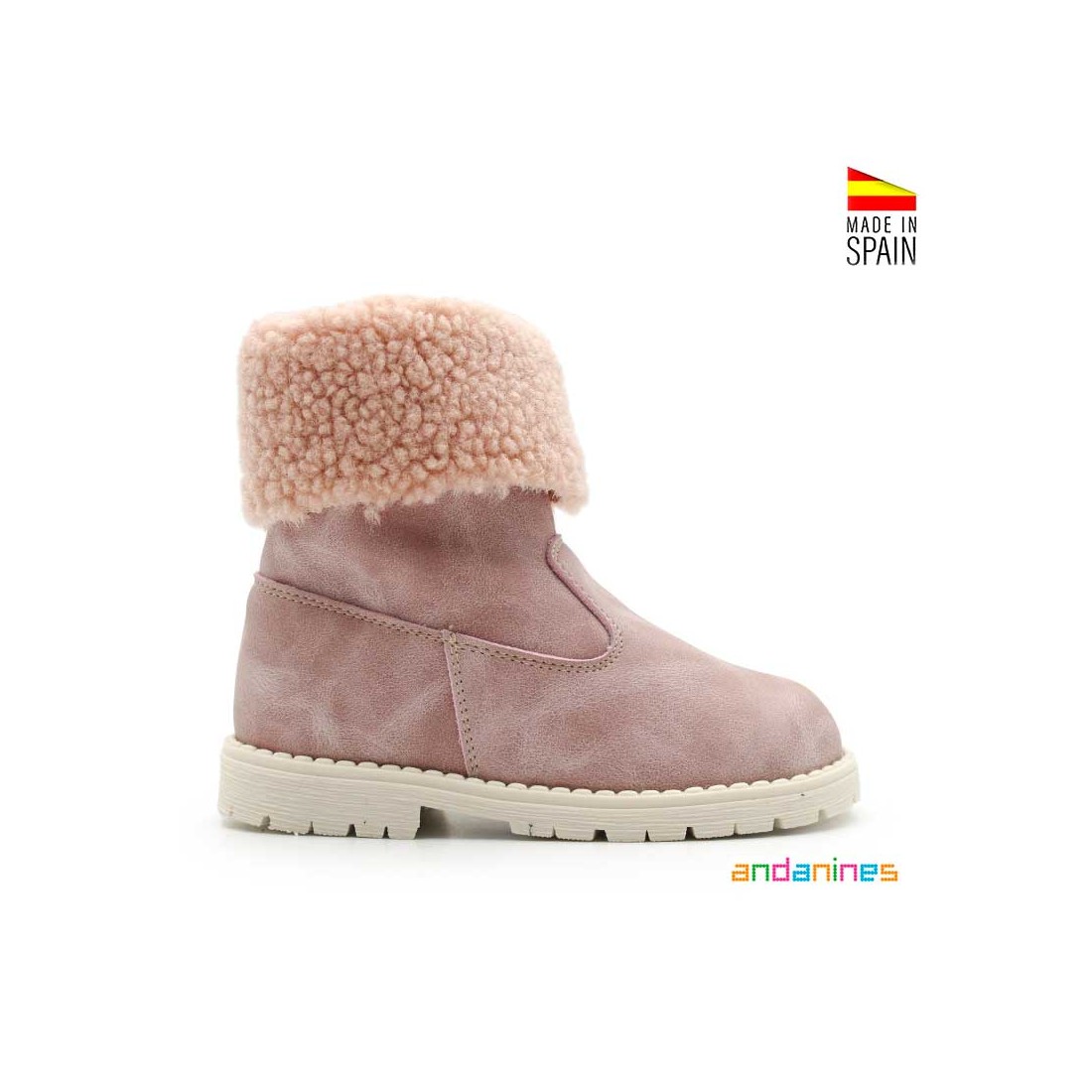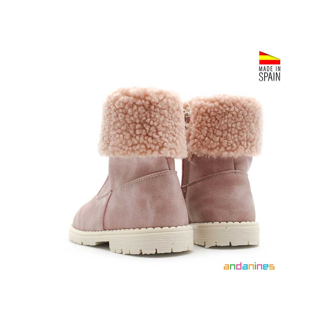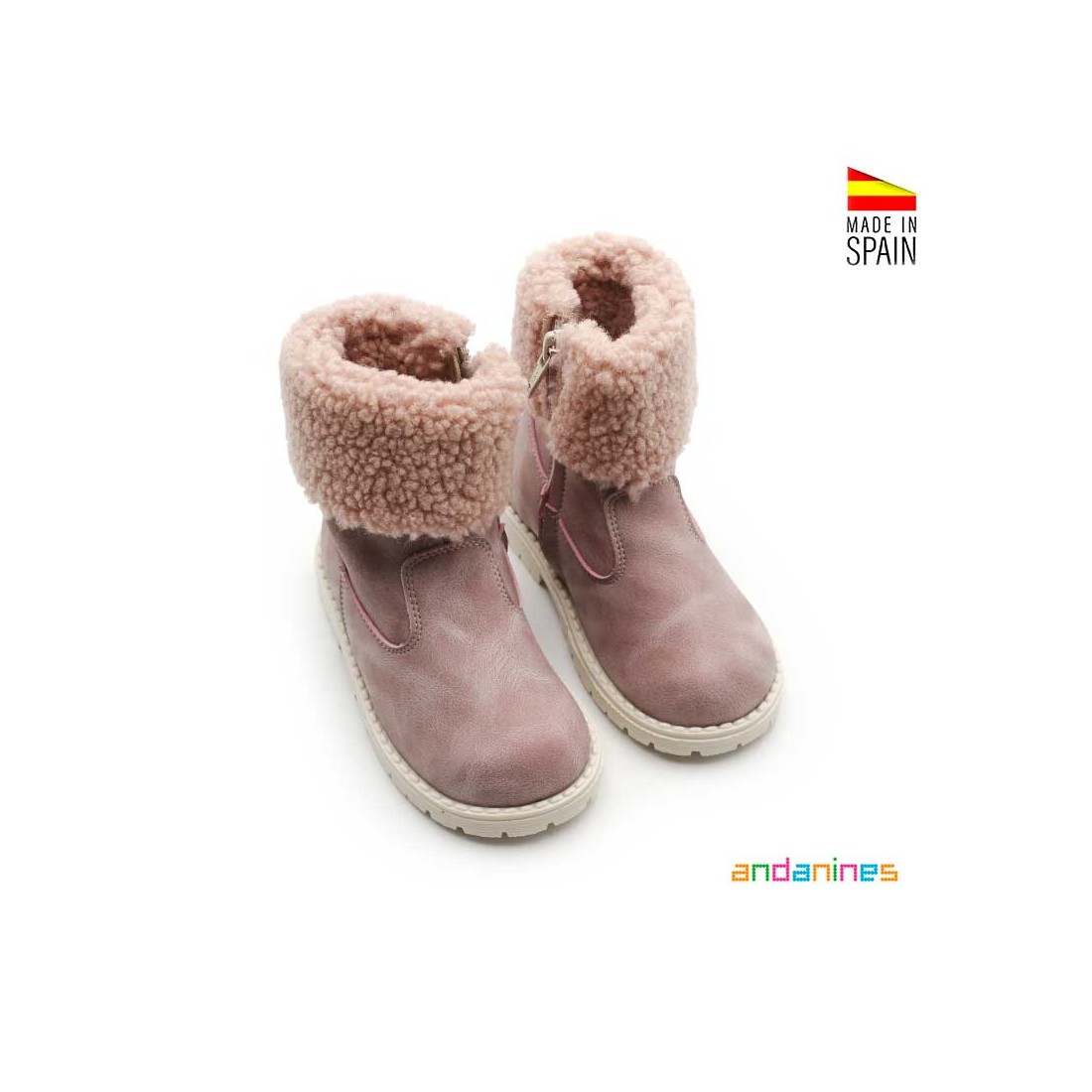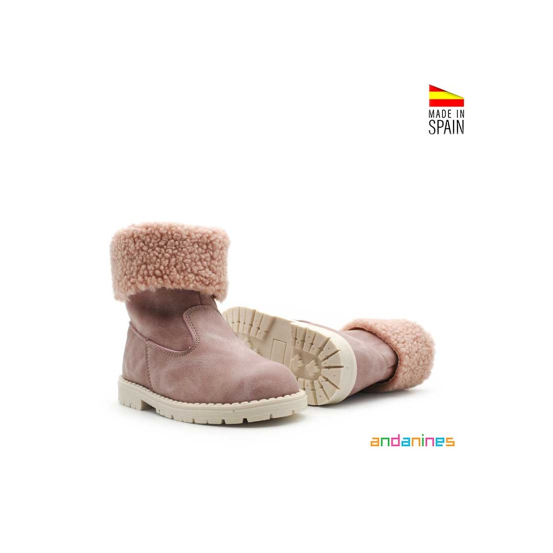 Confeccionadas en sintético con forro interior de borreguito y planta de antelina, ideal para mantener los pies calentitos y secos durante todo el invierno. Hechos en España por Andanines, estas botas son ideales tanto para el día a día como para looks más especiales gracias a su diseño cálido y femenino.