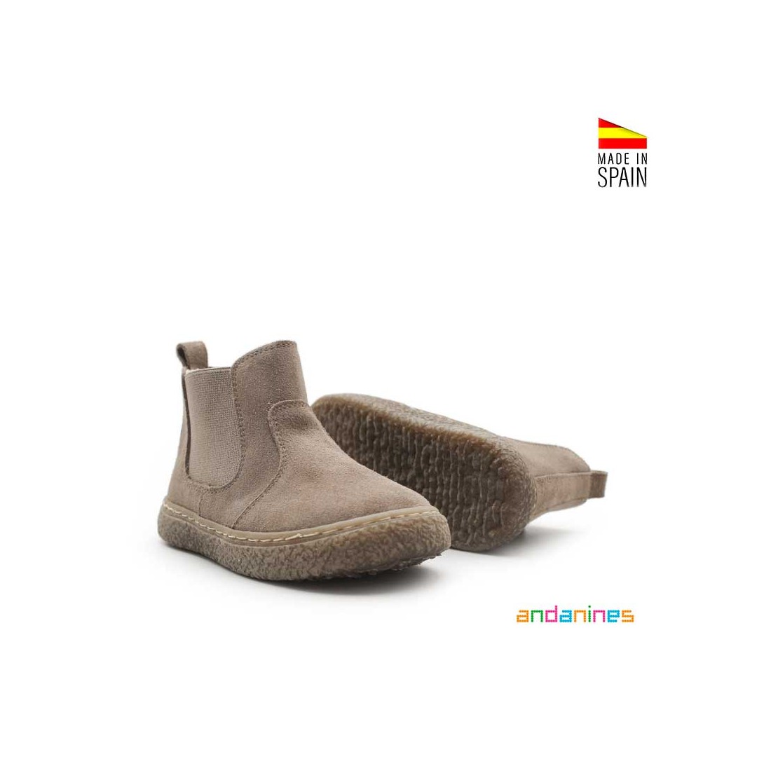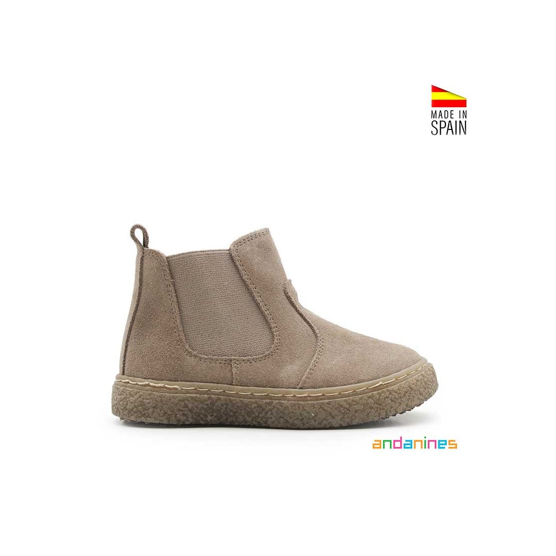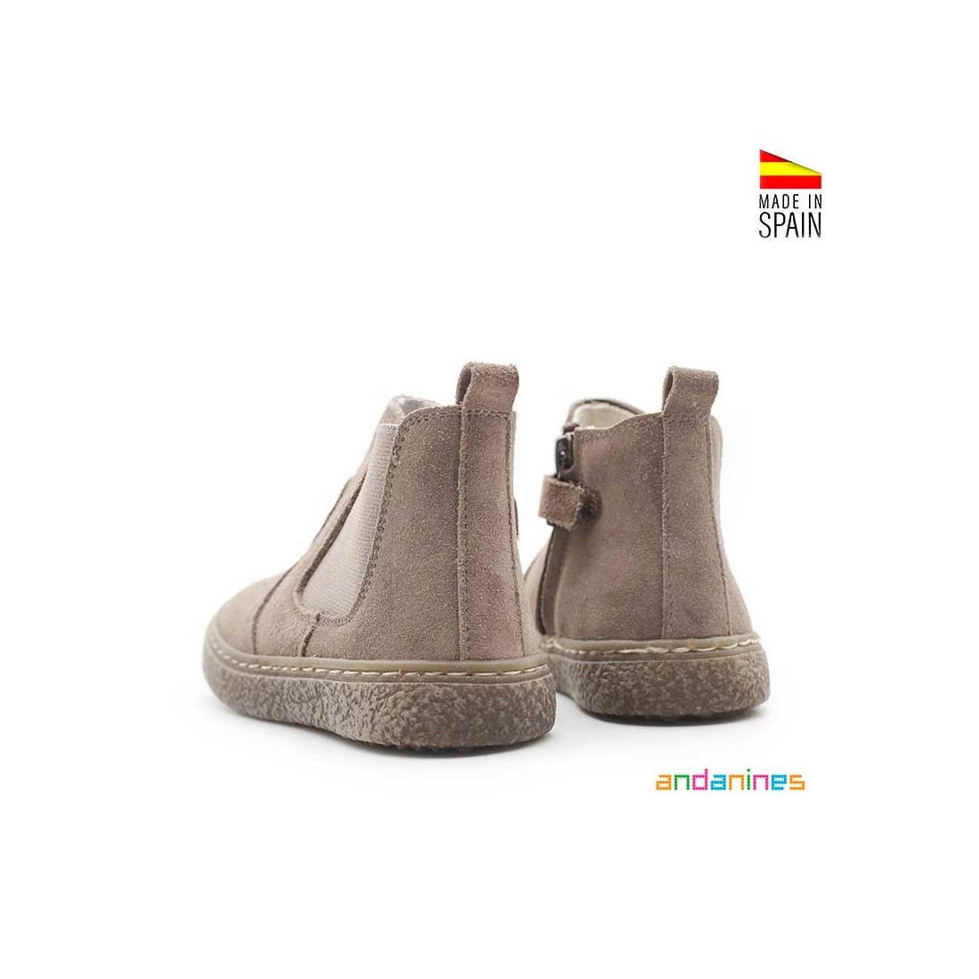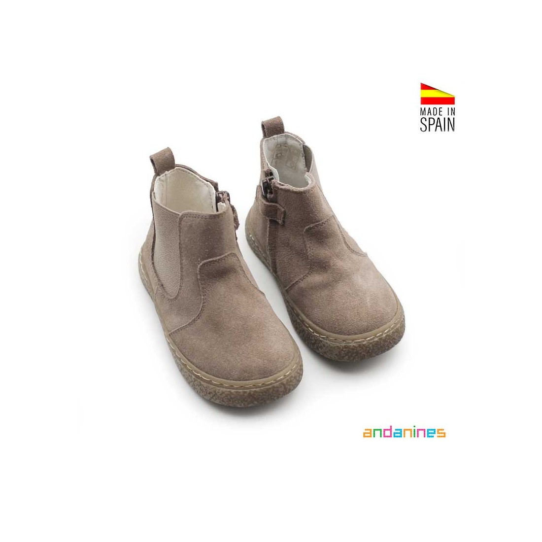 Diseño unisex para niños y niñas en color taupe de suave piel serraje, con elásticos laterales y una cremallera interior con seguro adherente que facilita el calce diario.