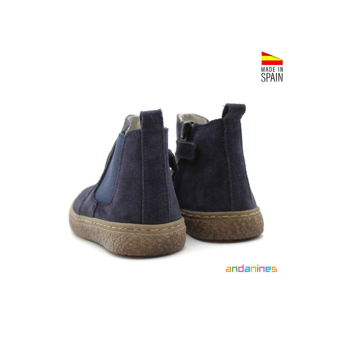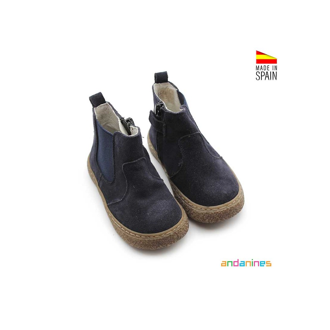Están fabricados en piel serraje azul marino, con elástico lateral al tono y cremallera en el lateral interior para poner y quitar fácilmente, perfecta para las niñas y niños más independientes que ya eligen su propio look.