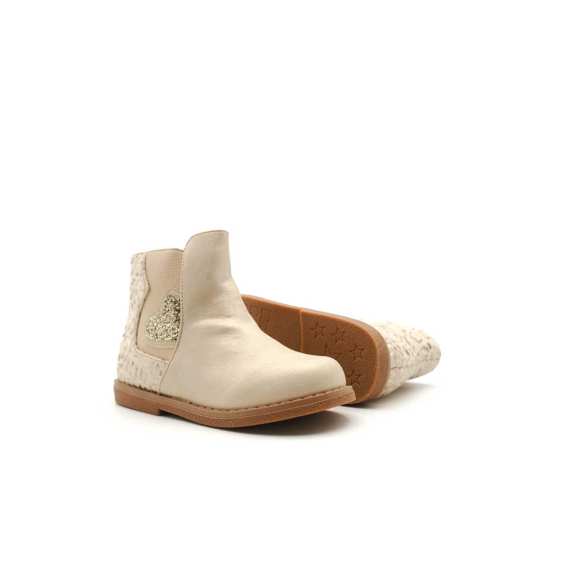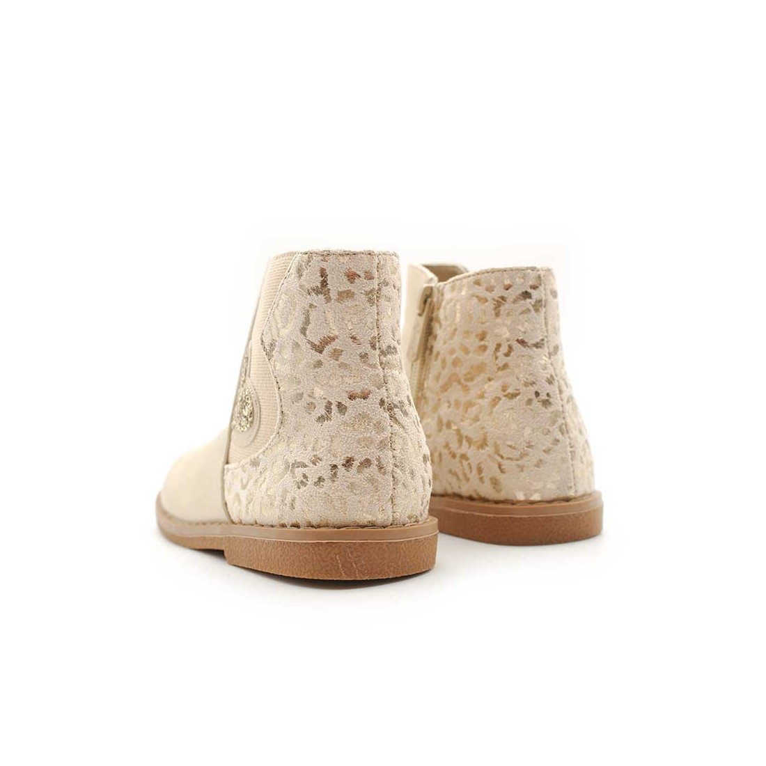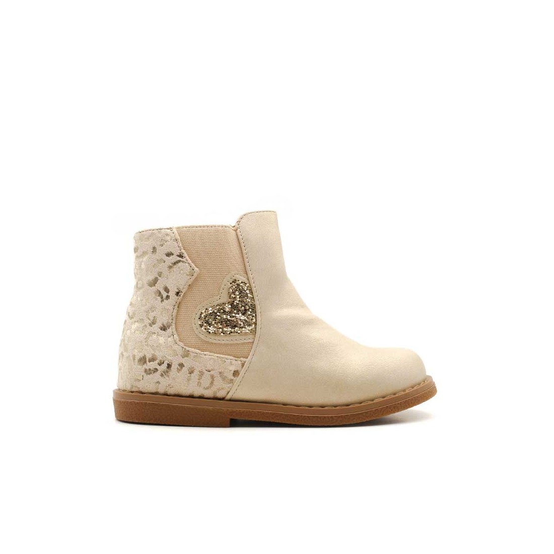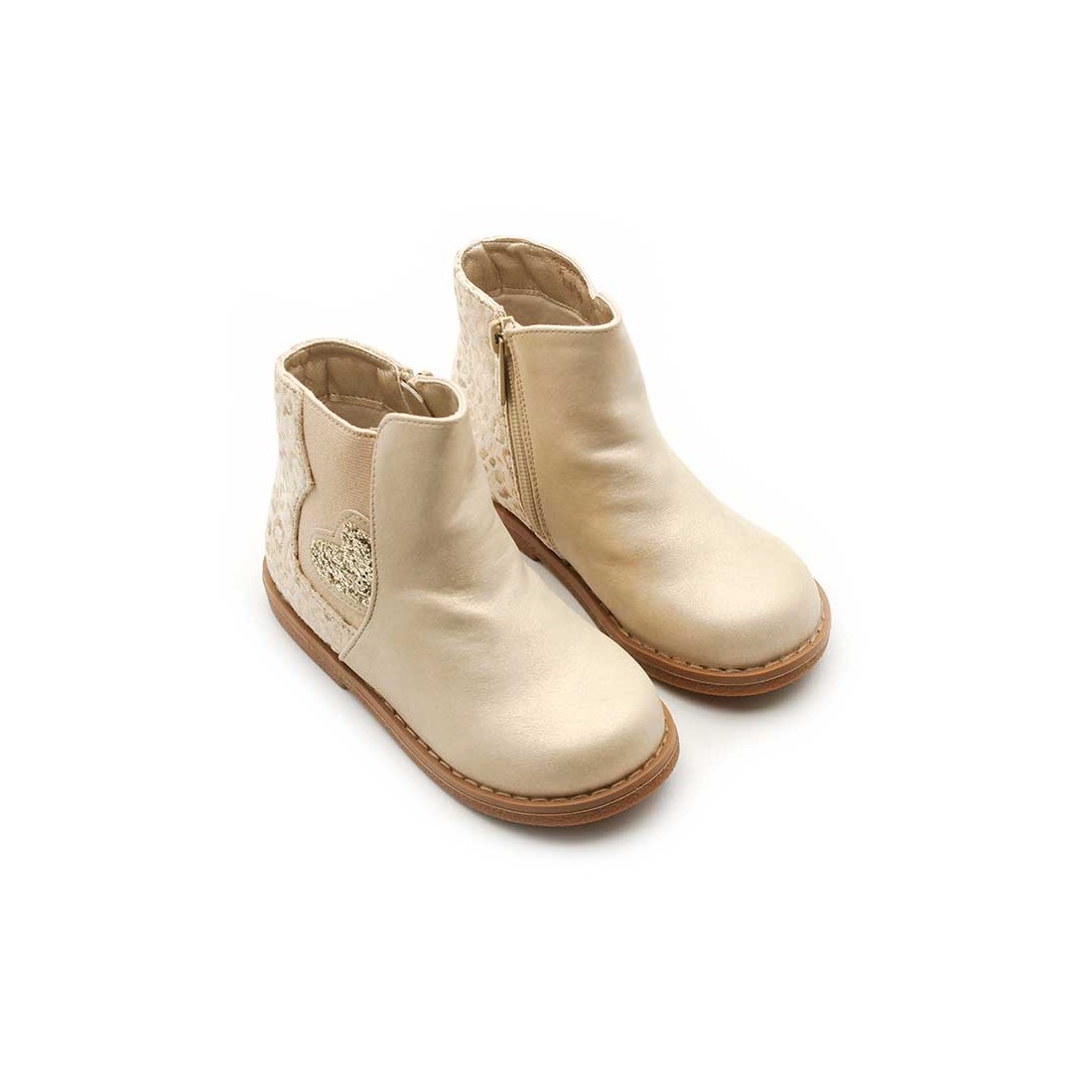 Dispone de cremallera lateral interior para facilitar el calce y elástico lateral exterior decorado con un precioso corazón de glitter dorado, que convierte este botín en un modelo único y lleno de encanto.
