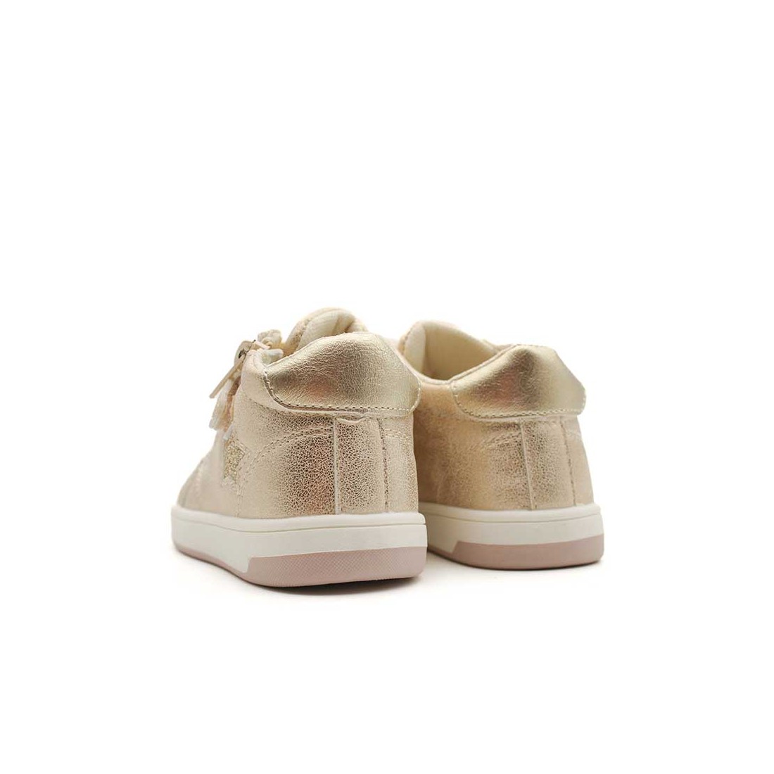 Su diseño moderno combina un detalle de estrella lateral con glitter y un talón metalizado que aportan un toque chic y divertido, ideal para completar cualquier look infantil.