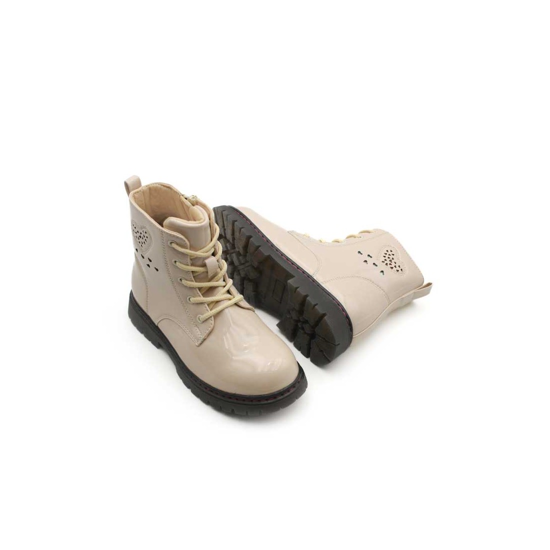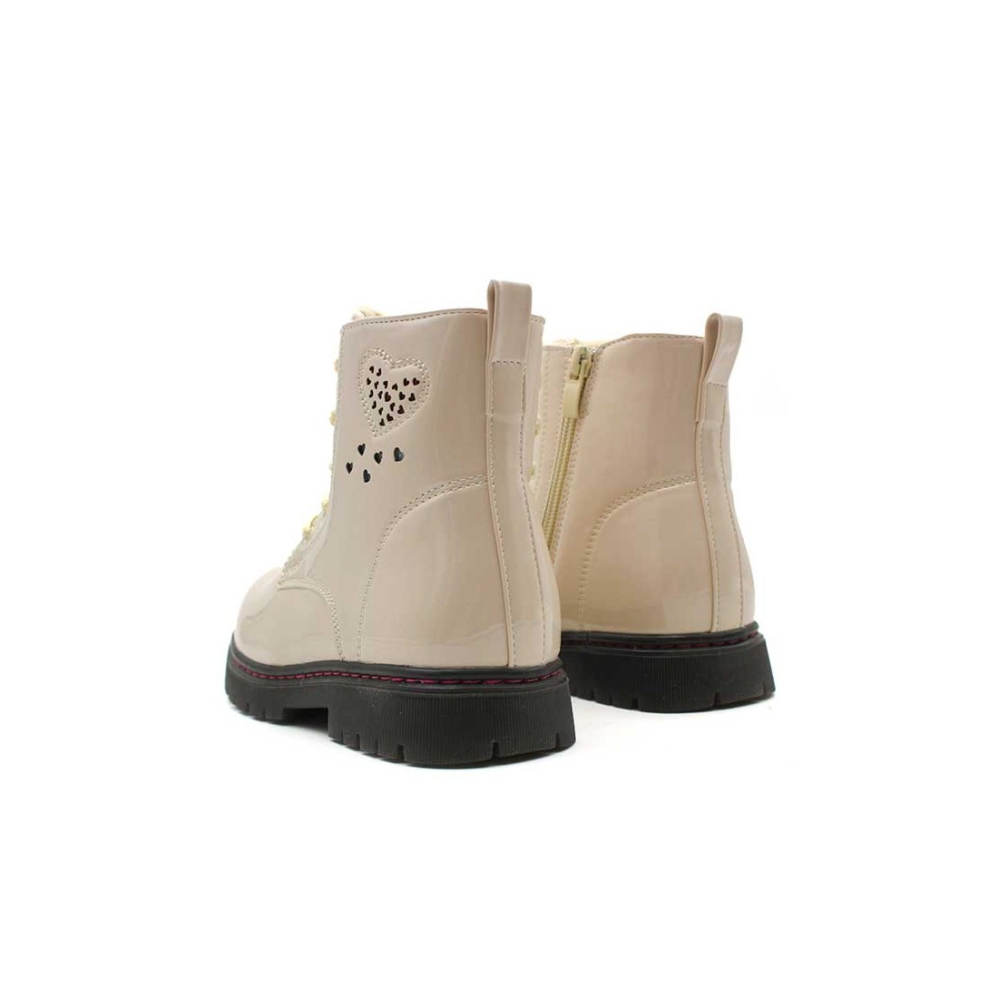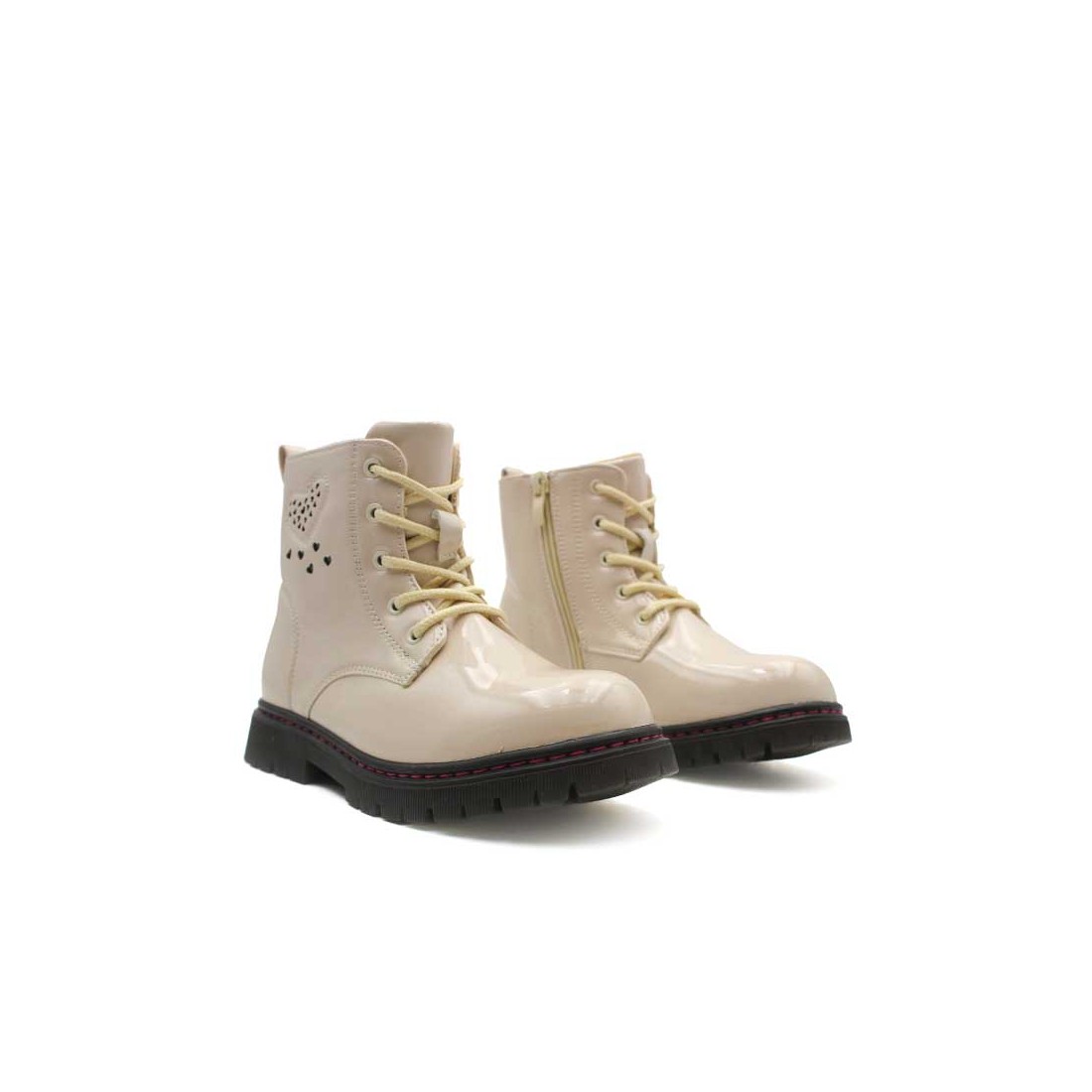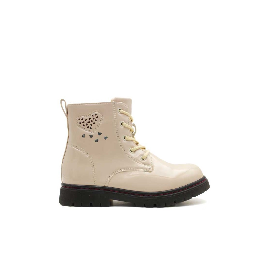 Diseño en charol beige, destacan por su brillo elegante y un toque dulce gracias a los corazones con glitter en el lateral, que añaden un aire divertido y femenino al clásico estilo militar.