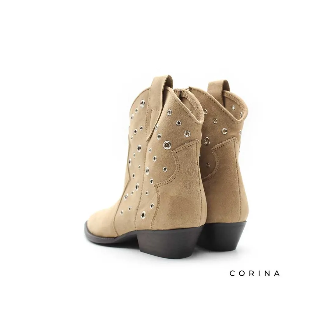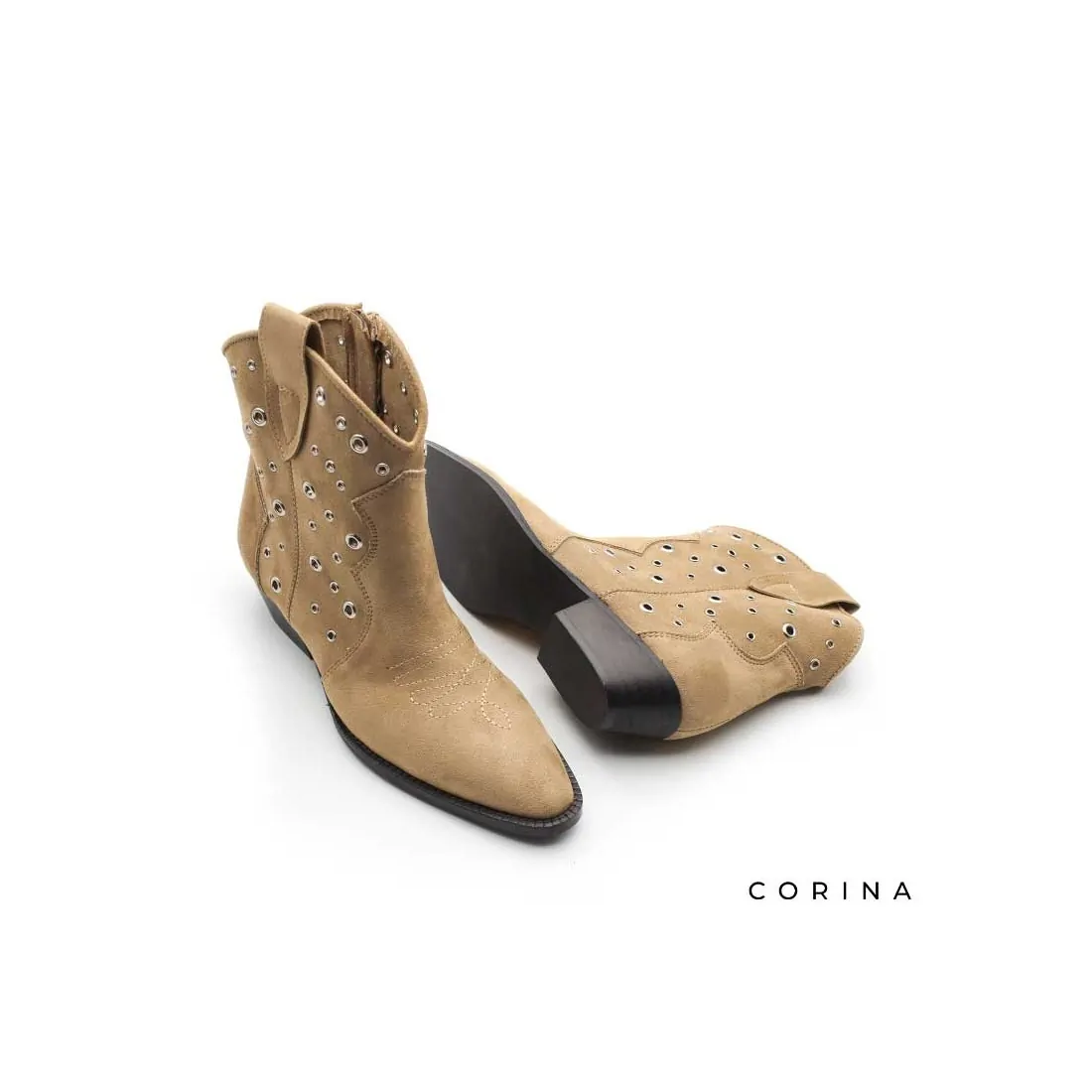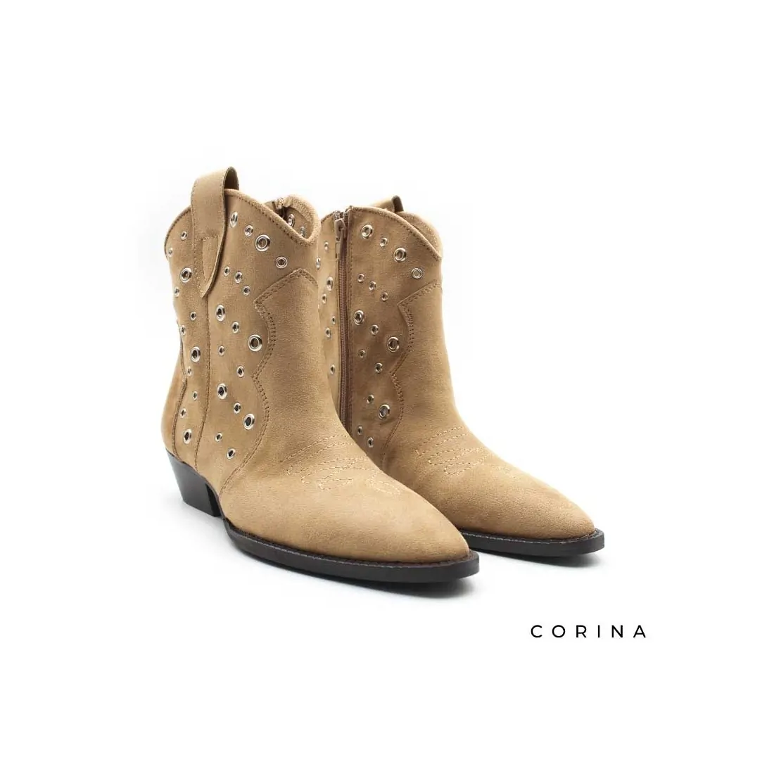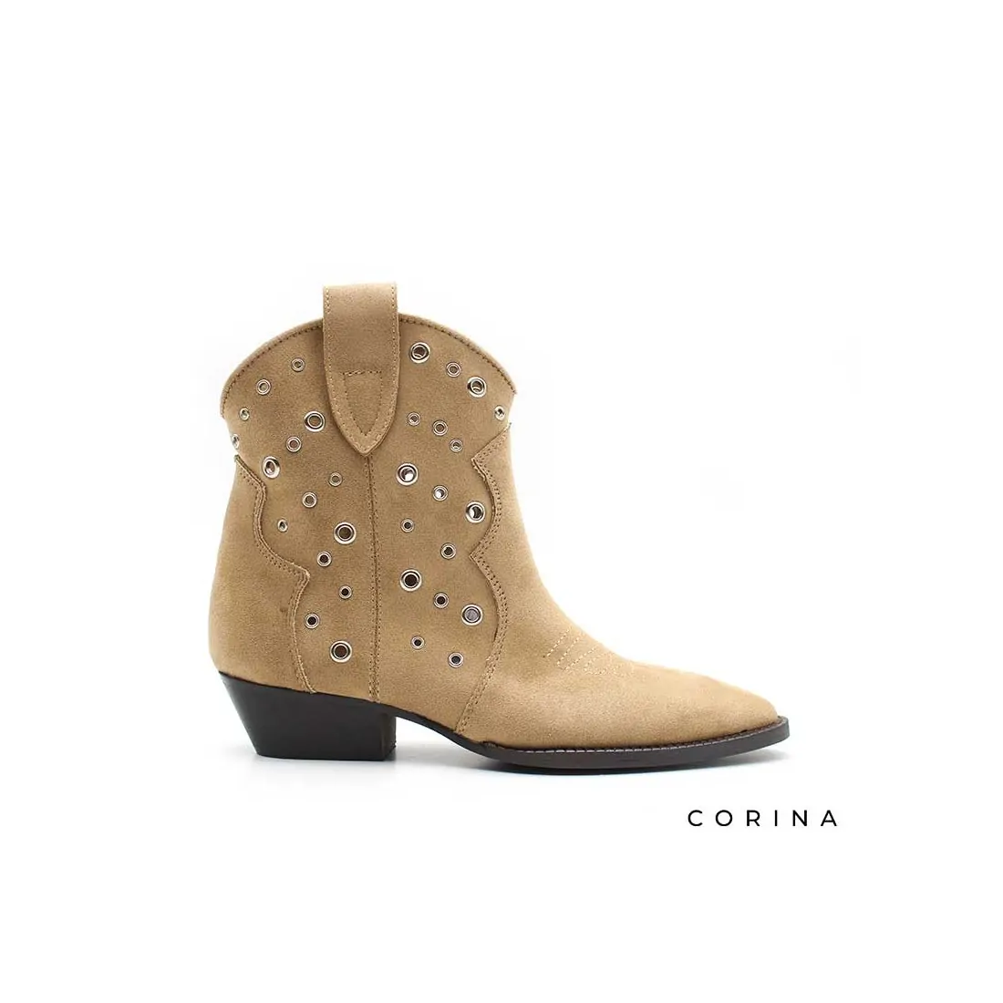 Con un diseño cowboy moderno en antelina camel, destacan por sus tachuelas metálicas: ojales plateados que adornan la caña de forma original y atrevida.