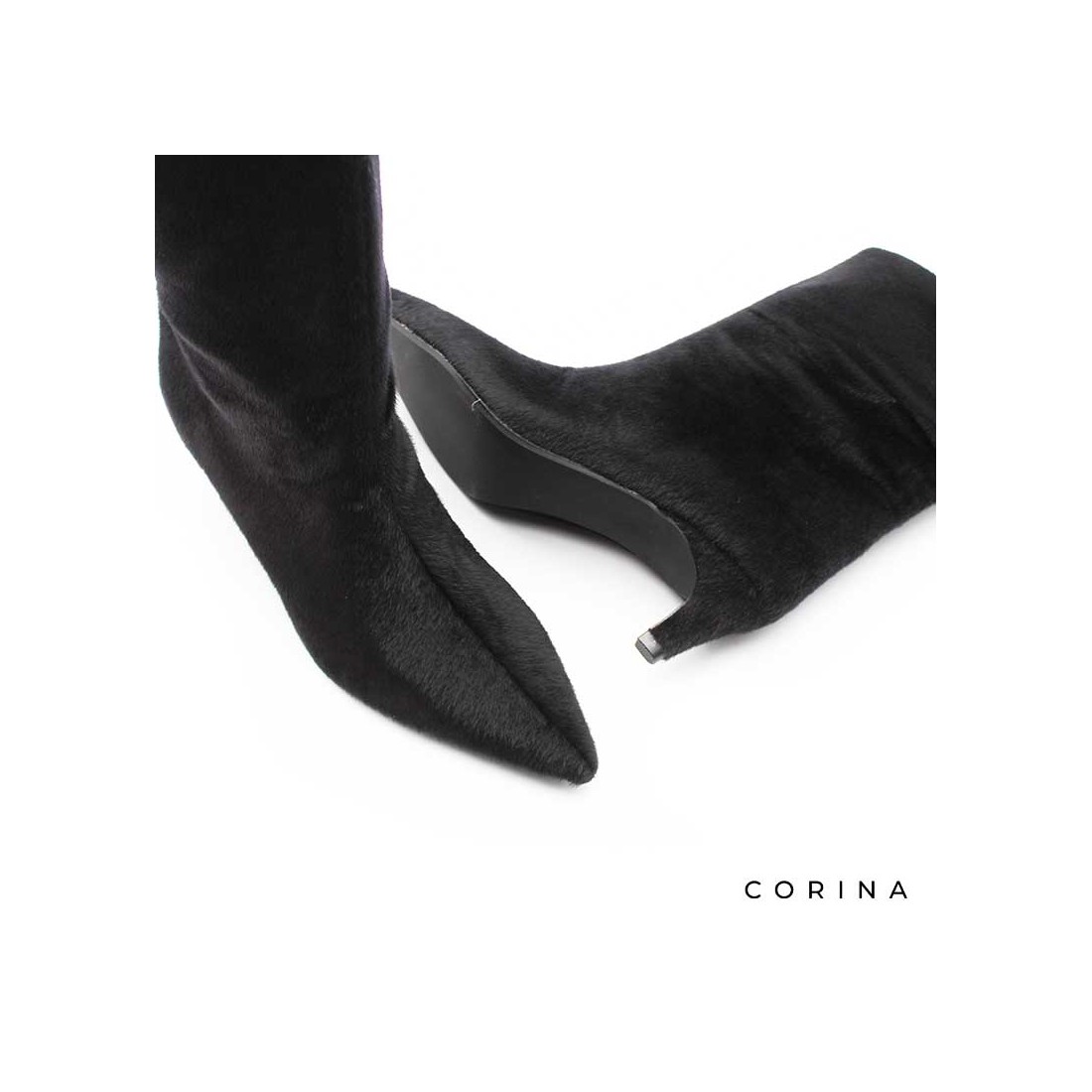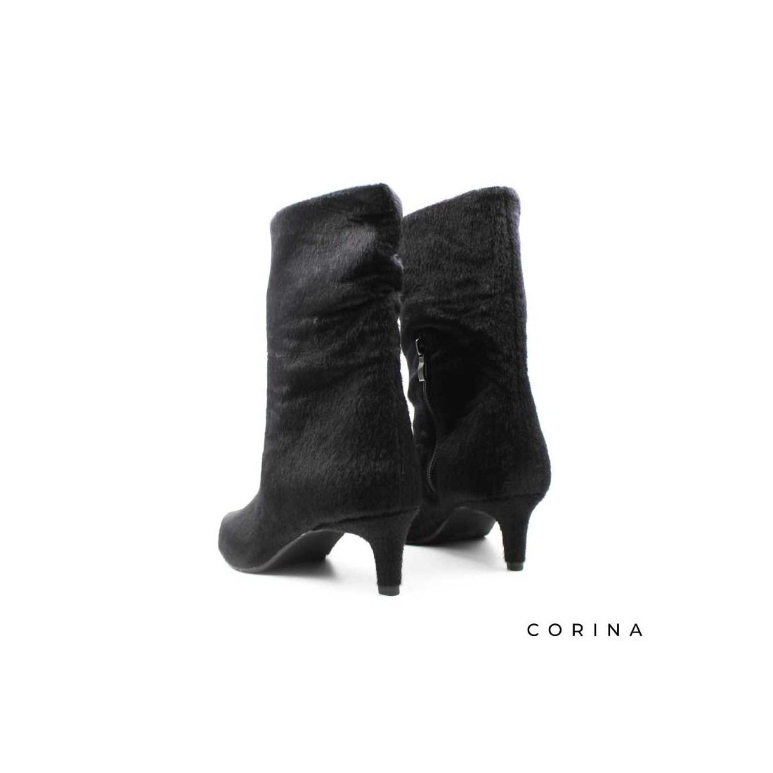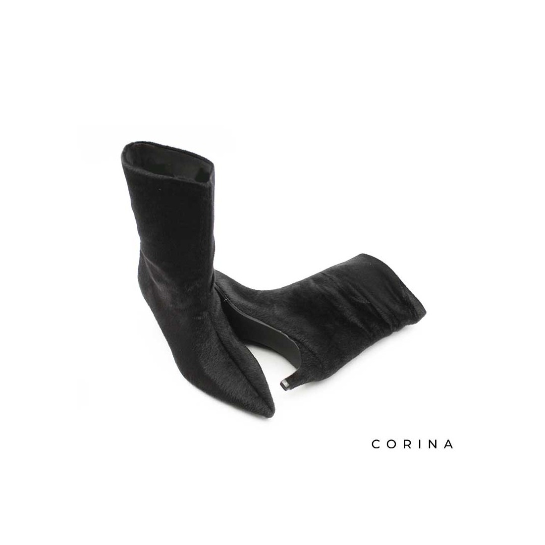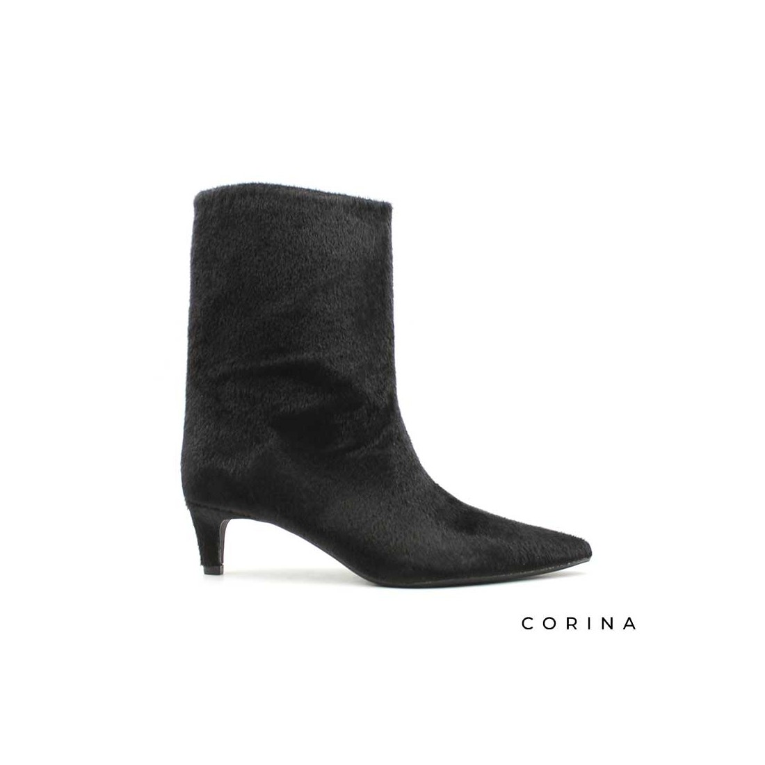 Este Botín Tacón Pelo en color negro es una pieza distintiva dentro de la colección de Corina, pensada para aportar un toque de sofisticación con un acabado inesperado.