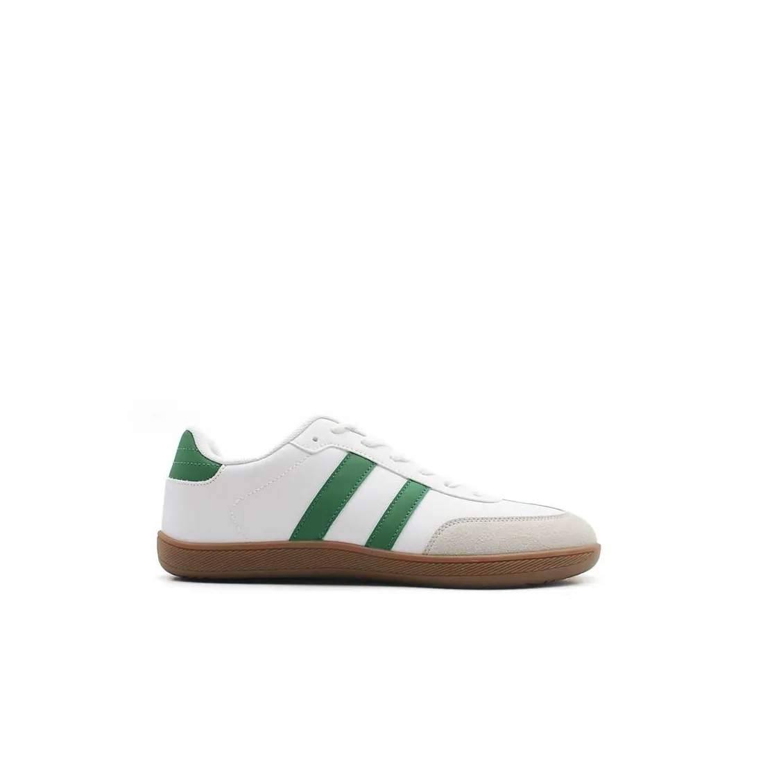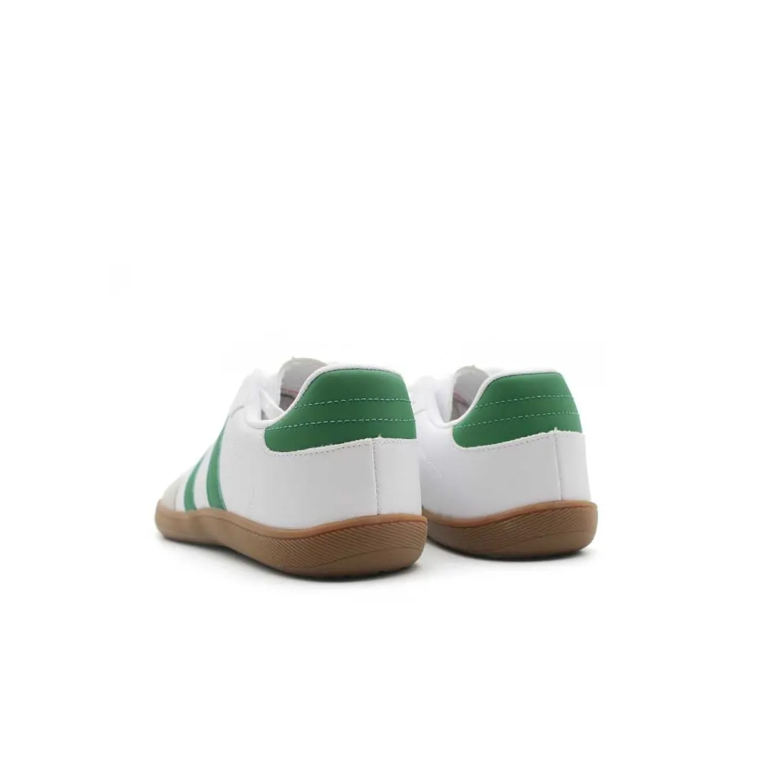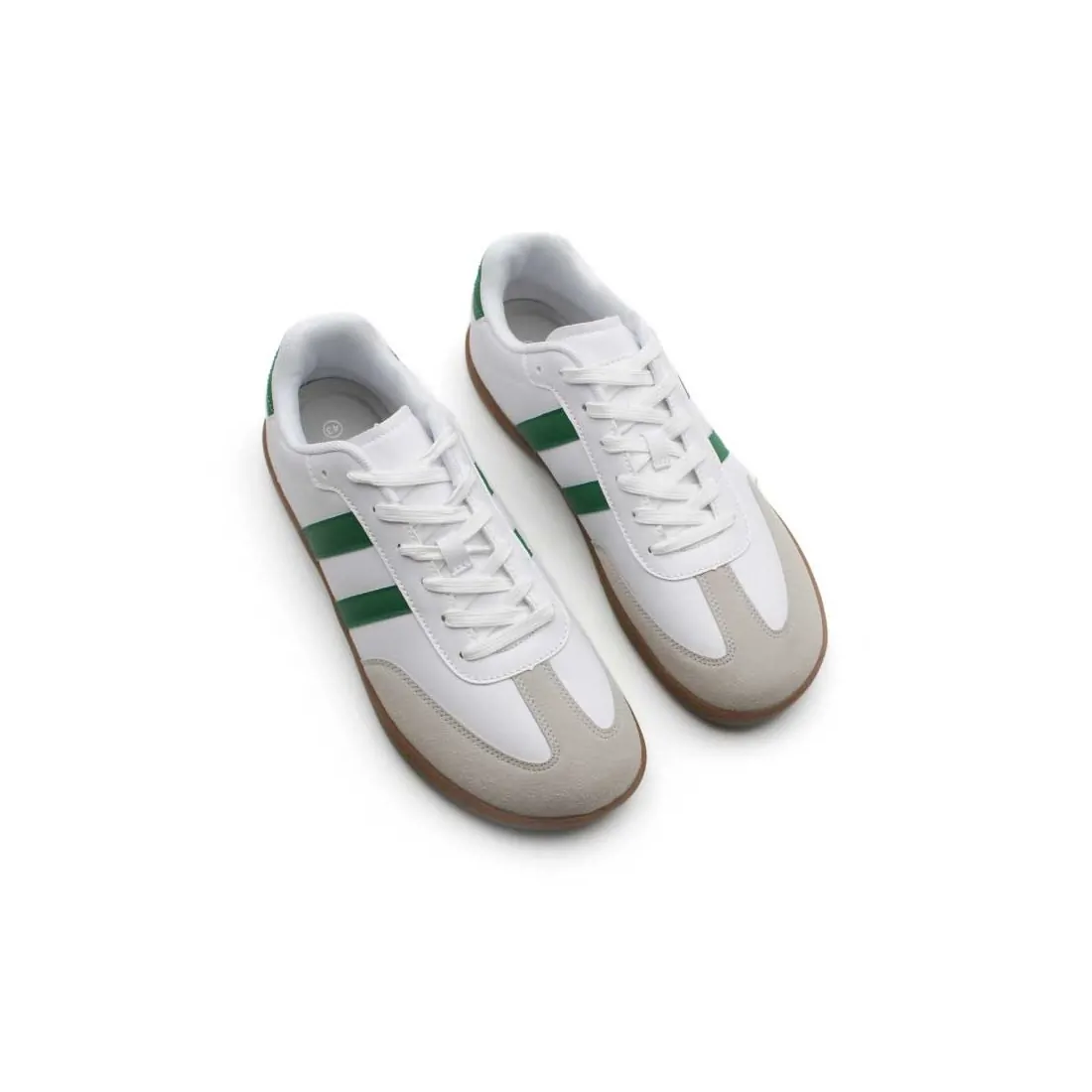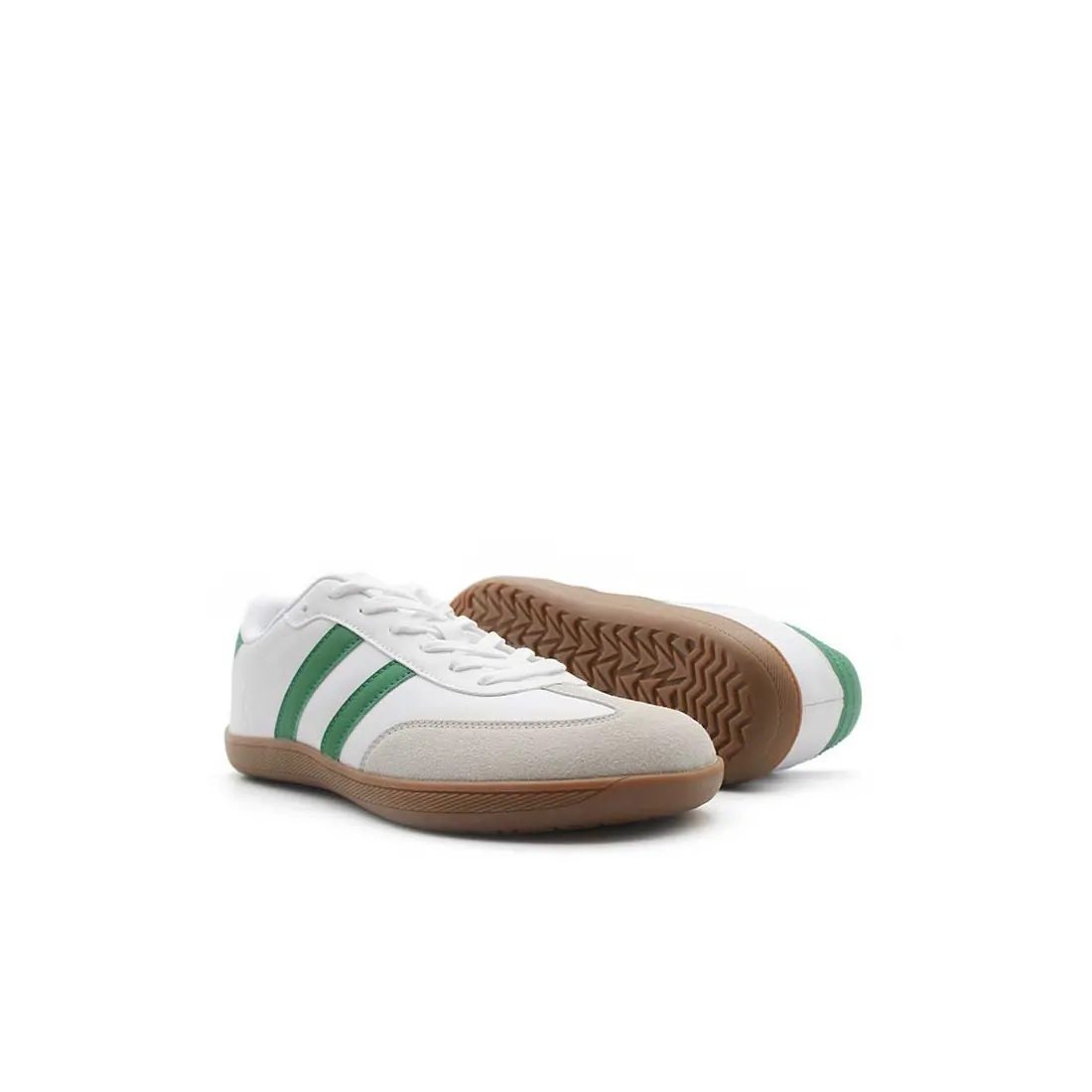 La base blanca se mezcla con una puntera de antelina gris y dos franjas laterales en verde, creando un look fresco, minimalista y fácil de llevar con cualquier conjunto.