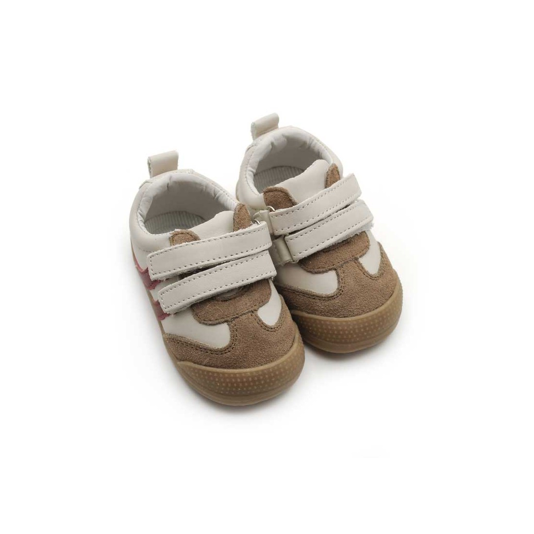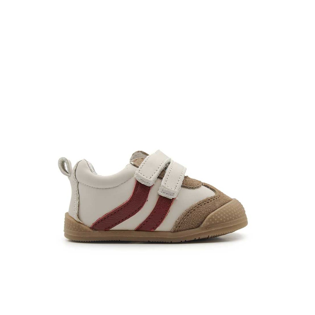 El Calzado Bebé Respetuoso en tonos beige y arena con detalle de rayas laterales en color burdeos está diseñado para acompañar los primeros pasos con total comodidad y seguridad.