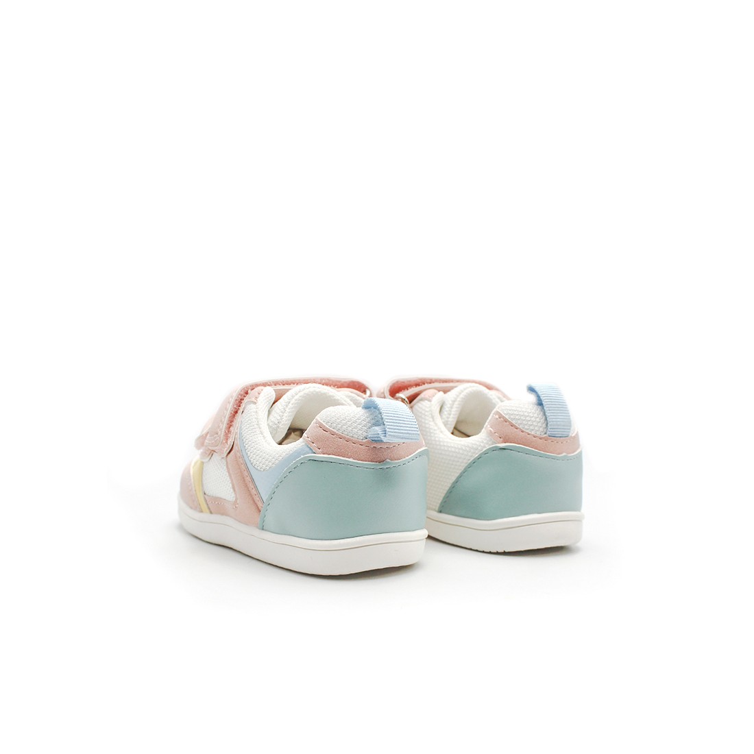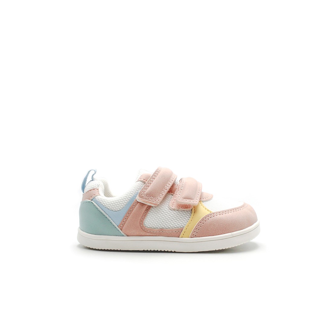 Su estructura flexible favorece una pisada libre, permitiendo que el pie se desarrolle sin restricciones. Su mezcla en colores pasteles como rosa suave, azul y amarillo crea un modelo alegre y fácil de combinar.