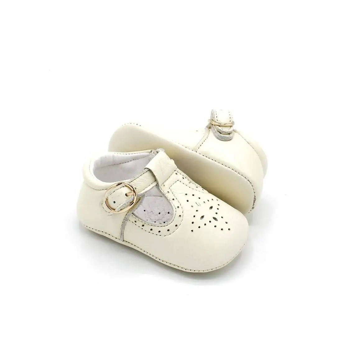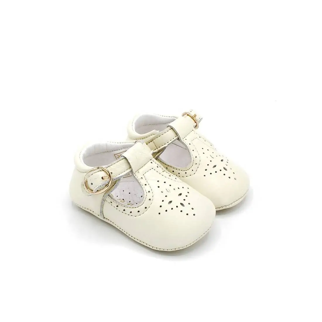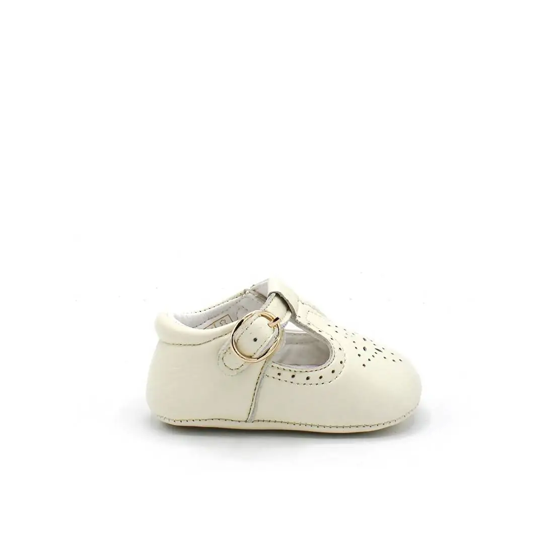 Estos zapatos para bebé son sin suela de piel, estilo badanitas o pepitos en color beige con calado y ajuste con cierre de hebilla color dorado.