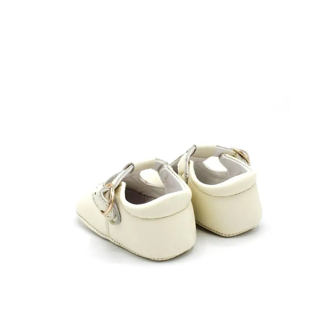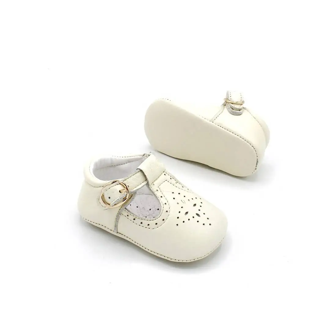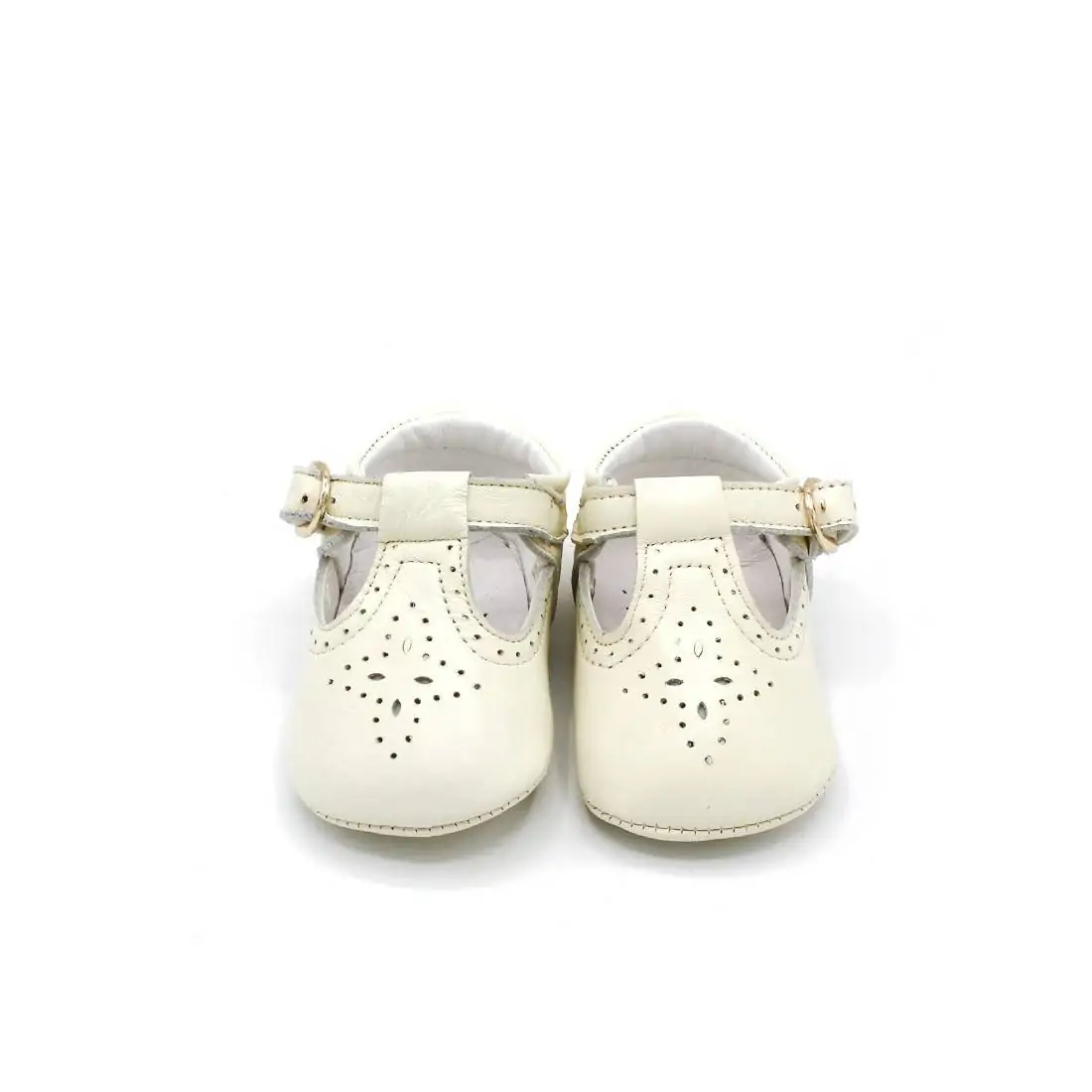 Estos zapatos para bebé son sin suela de piel, estilo badanitas o pepitos en color beige con calado y ajuste con cierre de hebilla color dorado.