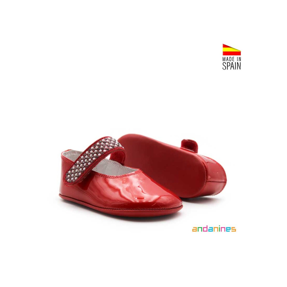 Su diseño tipo mercedita se cierra con velcro ancho decorado con tiras de perlas y strass, ideal para calzar y ajustar con facilidad, aportando además un toque festivo perfecto para eventos, fotos o celebraciones.