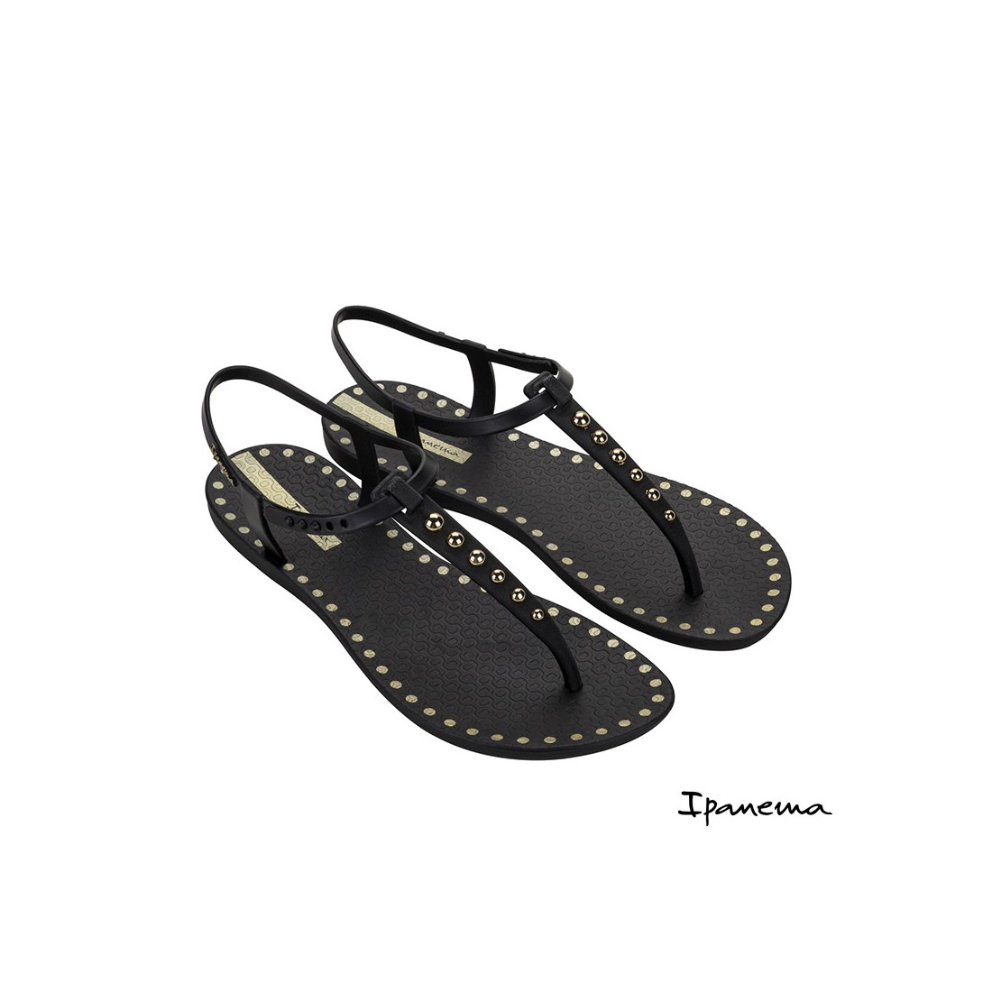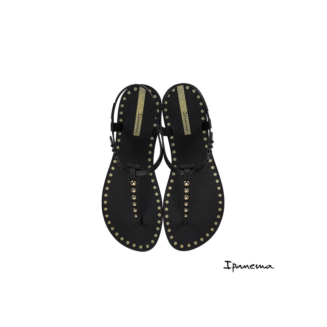 Este modelo Ipanema Class Dots destaca por su acabado en color negro decorado con pequeñas tachuelas doradas, un detalle que aporta un toque sofisticado sin perder su esencia casual.