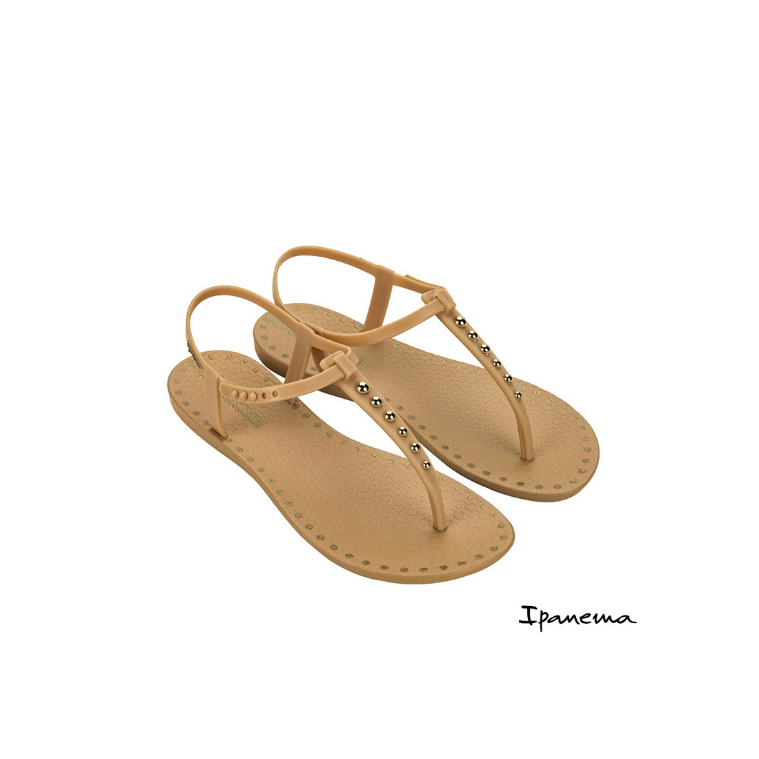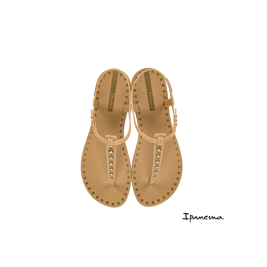 Esta sandalia de dedo para mujer presenta un diseño en color beige decorado con pequeñas tachuelas doradas en la tira central, aportando un toque sofisticado y femenino sin perder la esencia minimalista de la marca.