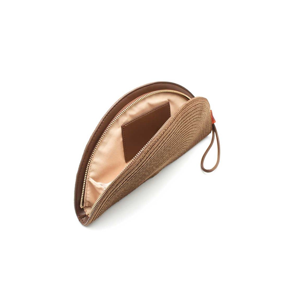 El cierre con cremallera mantiene tus objetos protegidos, mientras que el asa corta con pieza efecto carey añade un detalle diferenciador. En el interior, el forro textil incluye un departamento práctico para organizar lo esencial.