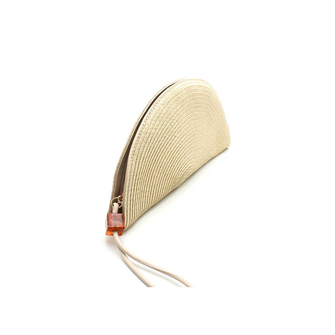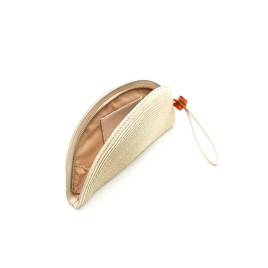 Este bolso en color beige natural es la definición de elegancia sencilla. Su diseño tipo abanico en rafia aporta textura y ligereza, convirtiéndolo en un básico imprescindible para la temporada.