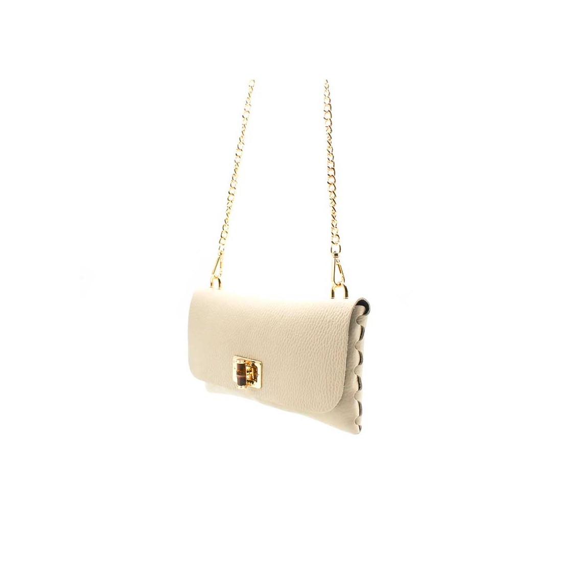La cadena dorada permite adaptarla a distintos momentos: al hombro para un uso más dinámico o en mano para una presencia más depurada. Su interior, forrado y con compartimento, está pensado para facilitar el día a día sin perder coherencia estética.