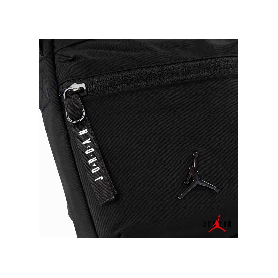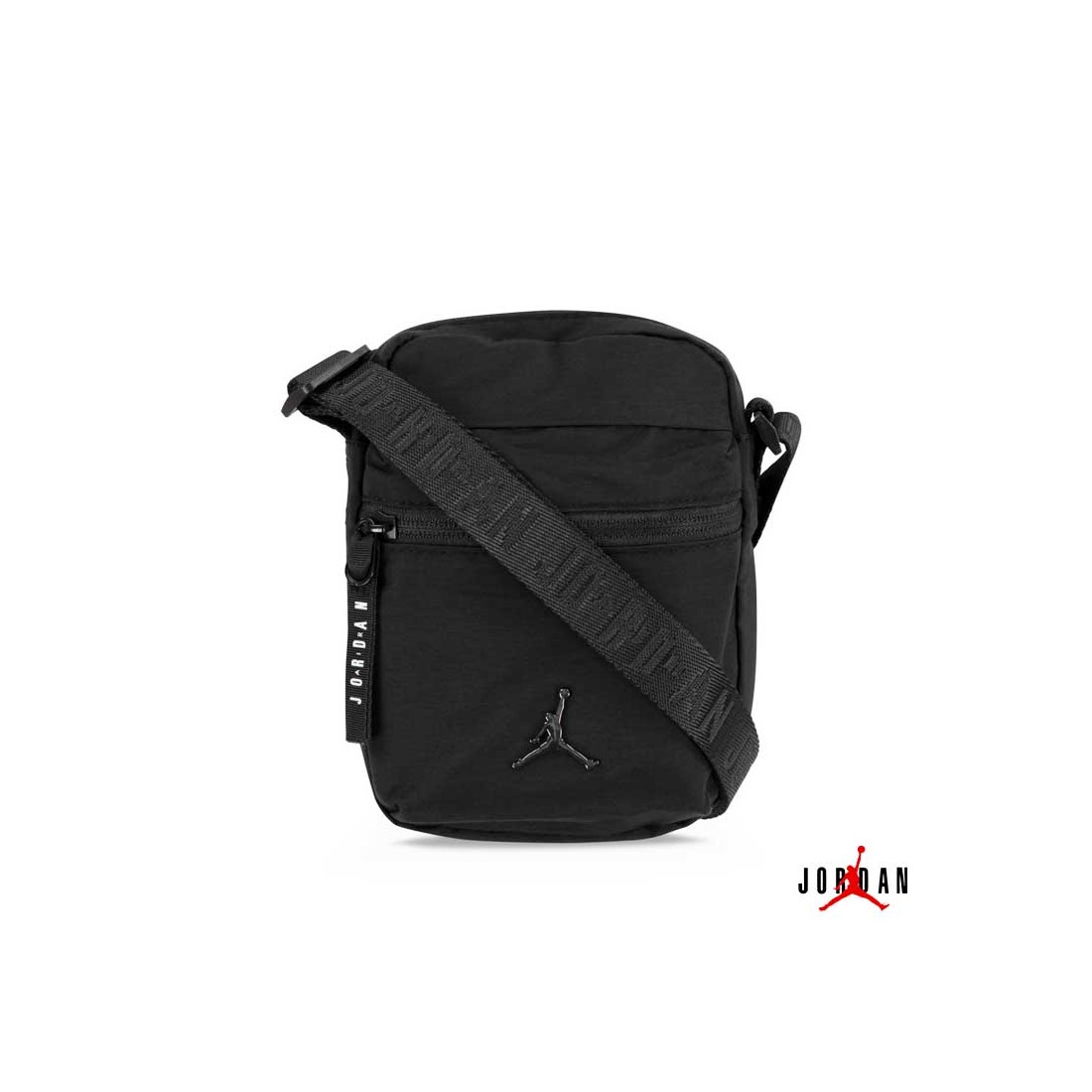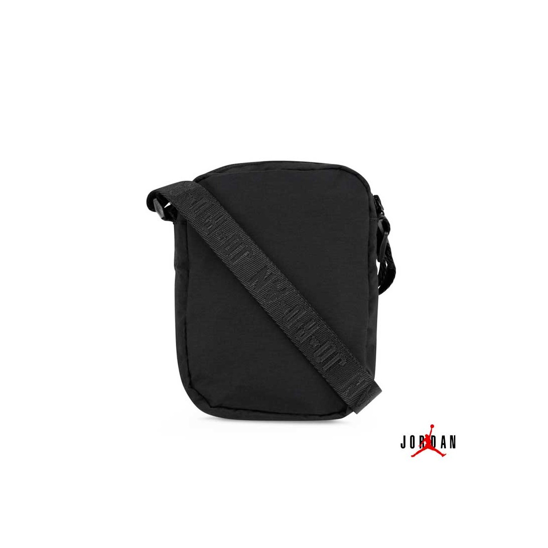 Fabricado en material sintético duradero, cuenta con un compartimento principal con cremallera, bolsillo frontal y correa ajustable con el nombre Jordan en relieve.
