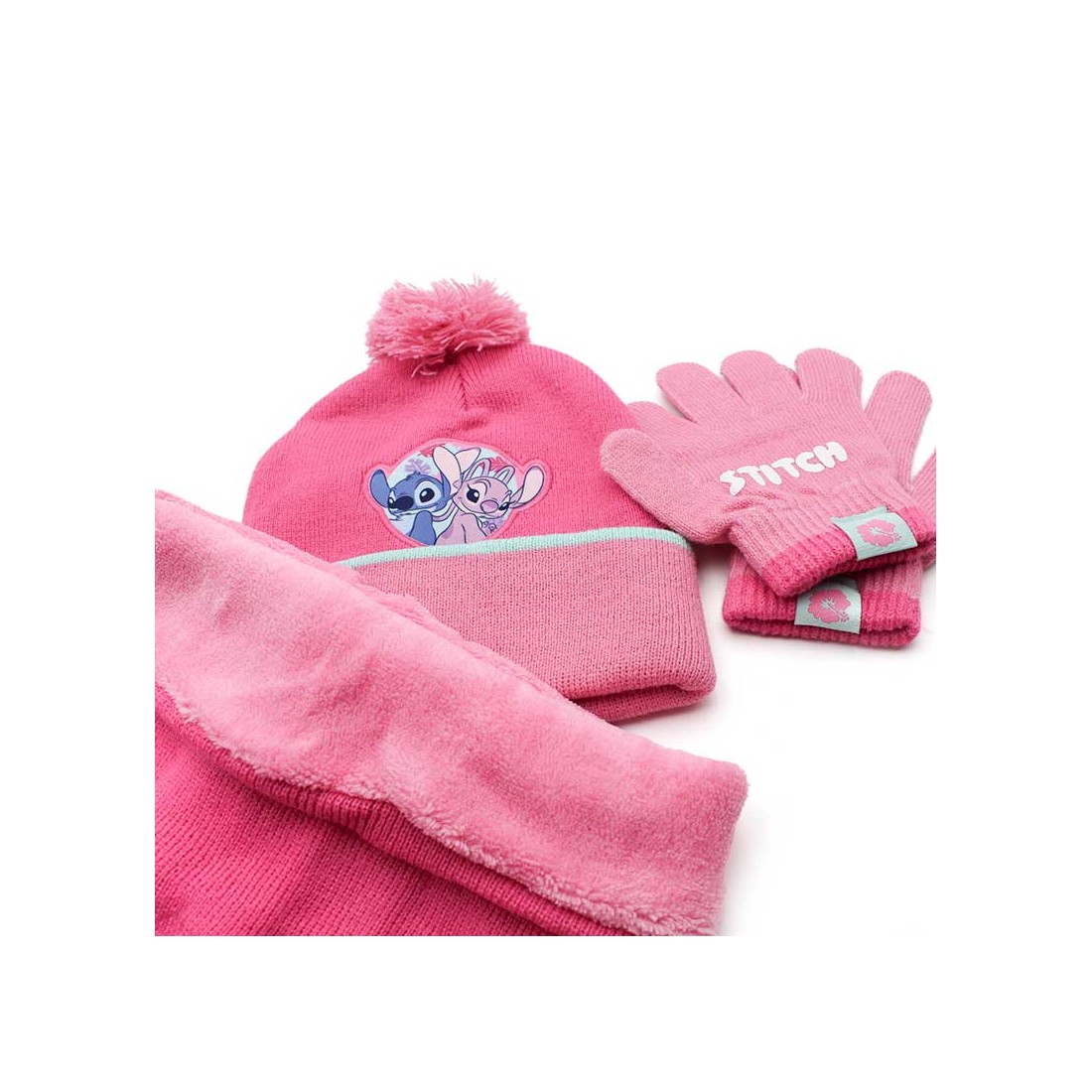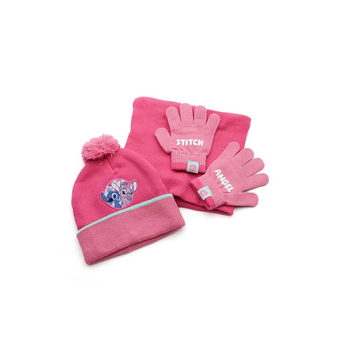 Incluye gorro con pompón, bufanda tipo cuello y guantes a juego, con detalles de Stitch y Angel.