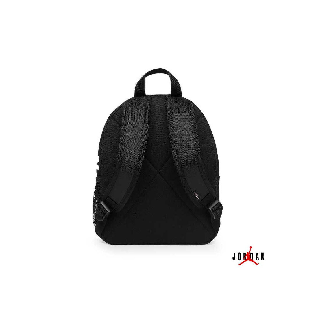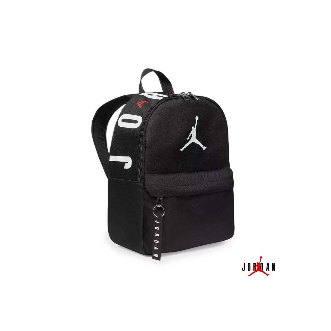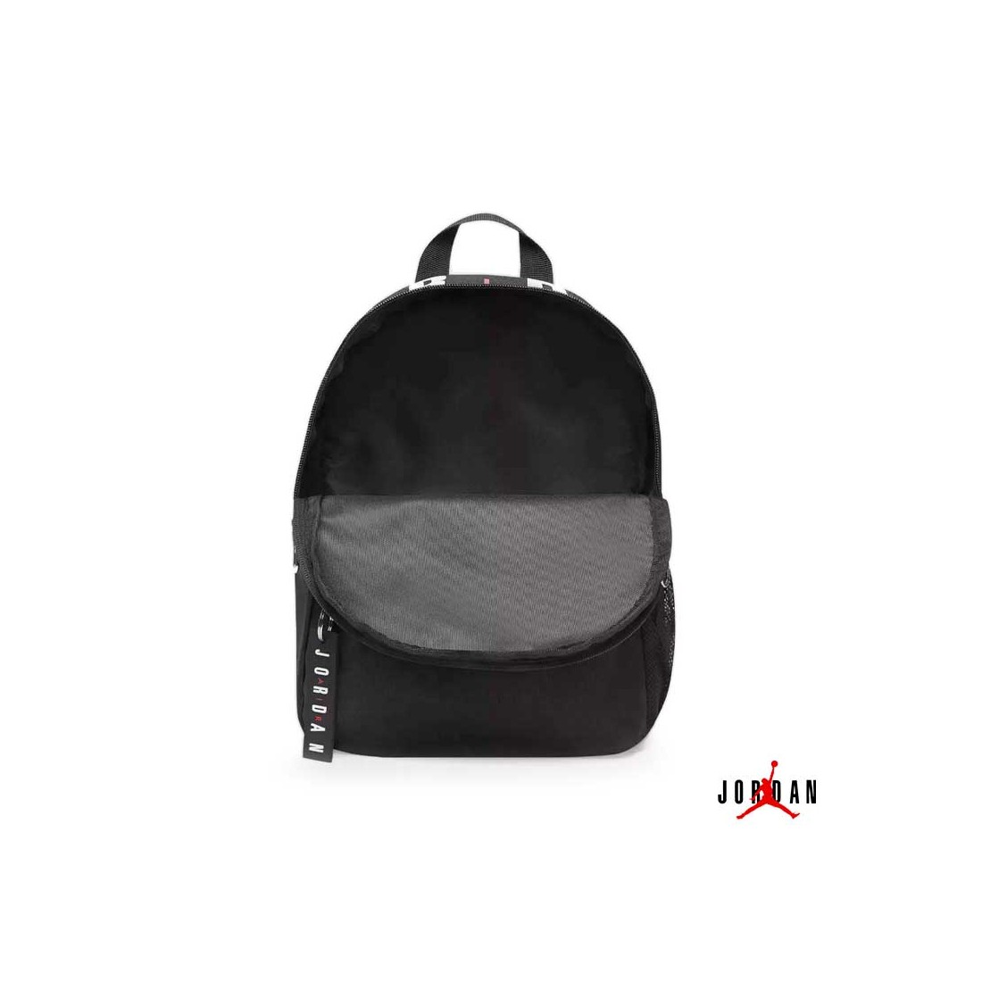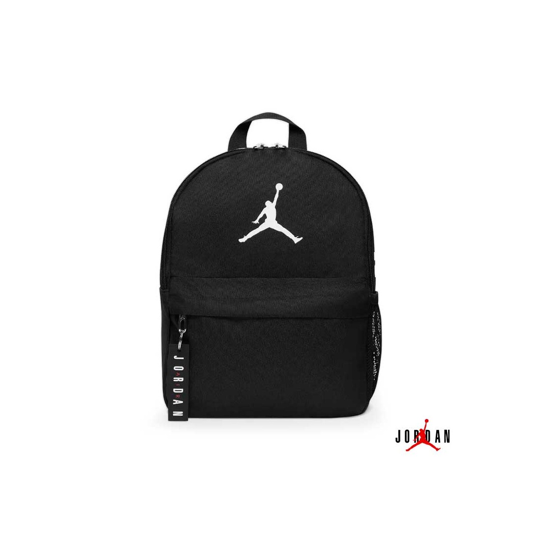 Dispone de un compartimento principal amplio con doble cremallera, bolsillo delantero independiente con cremallera y tirador de goma con el nombre Jordan.
