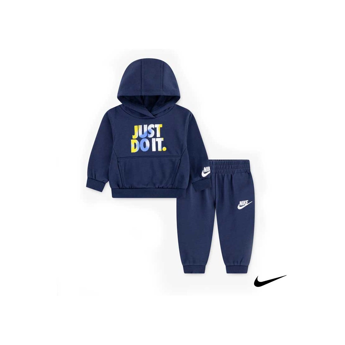 El pantalón de jogging tiene cintura elástica y puños de canalé, porque lo importante es correr, saltar y reír sin límites. Además, cuenta con el icónico logo bordado de Nike en la manga y el pantalón, para que tu peque lleve estilo premium de pies a cabeza.