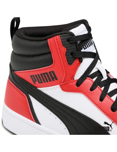 En Calzados Elche, traemos la esencia de la moda y el rendimiento con el PUMA Rebound V6 en blanco, rojo y negro.