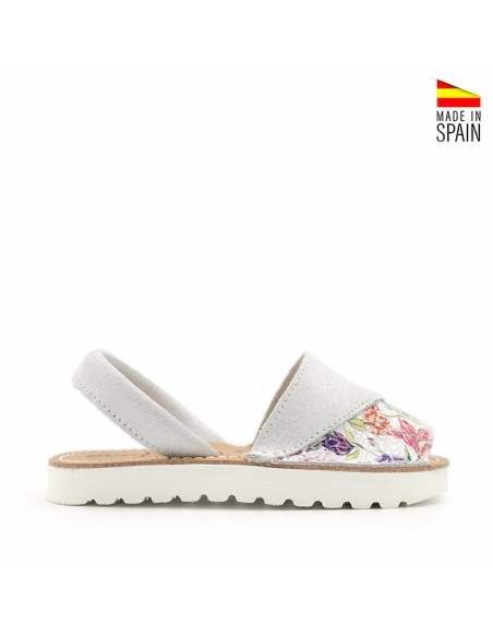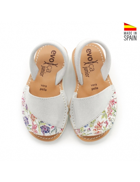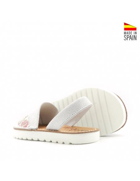 Fabricadas en piel serraje suave de alta calidad, estas abarcas en color blanco con brillo combinado con flores de colores tambien en piel.