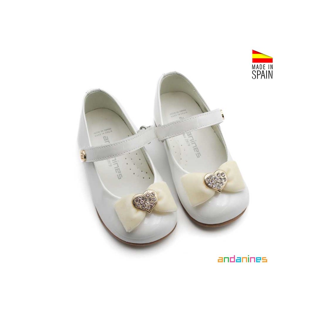 Su acabado en charol blanco aporta un toque elegante y fácil de combinar, mientras el lazo de terciopelo en la puntera suma dulzura y estilo.