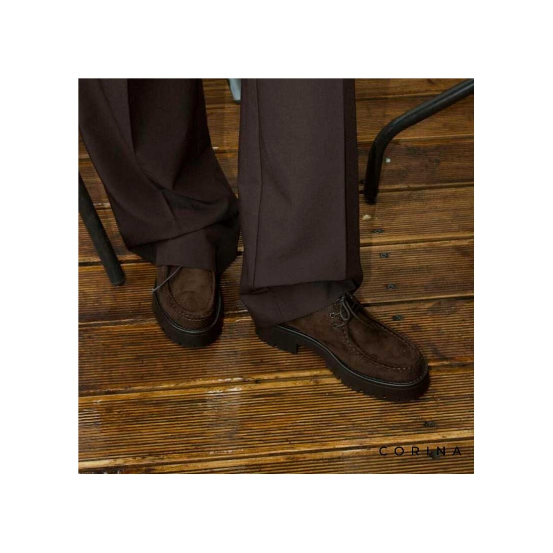 Fabricados en antelina color marrón, estos mocasines destacan por su diseño atemporal con costuras marcadas y un práctico cierre de cordones finos que aporta un toque sobrio y elegante.