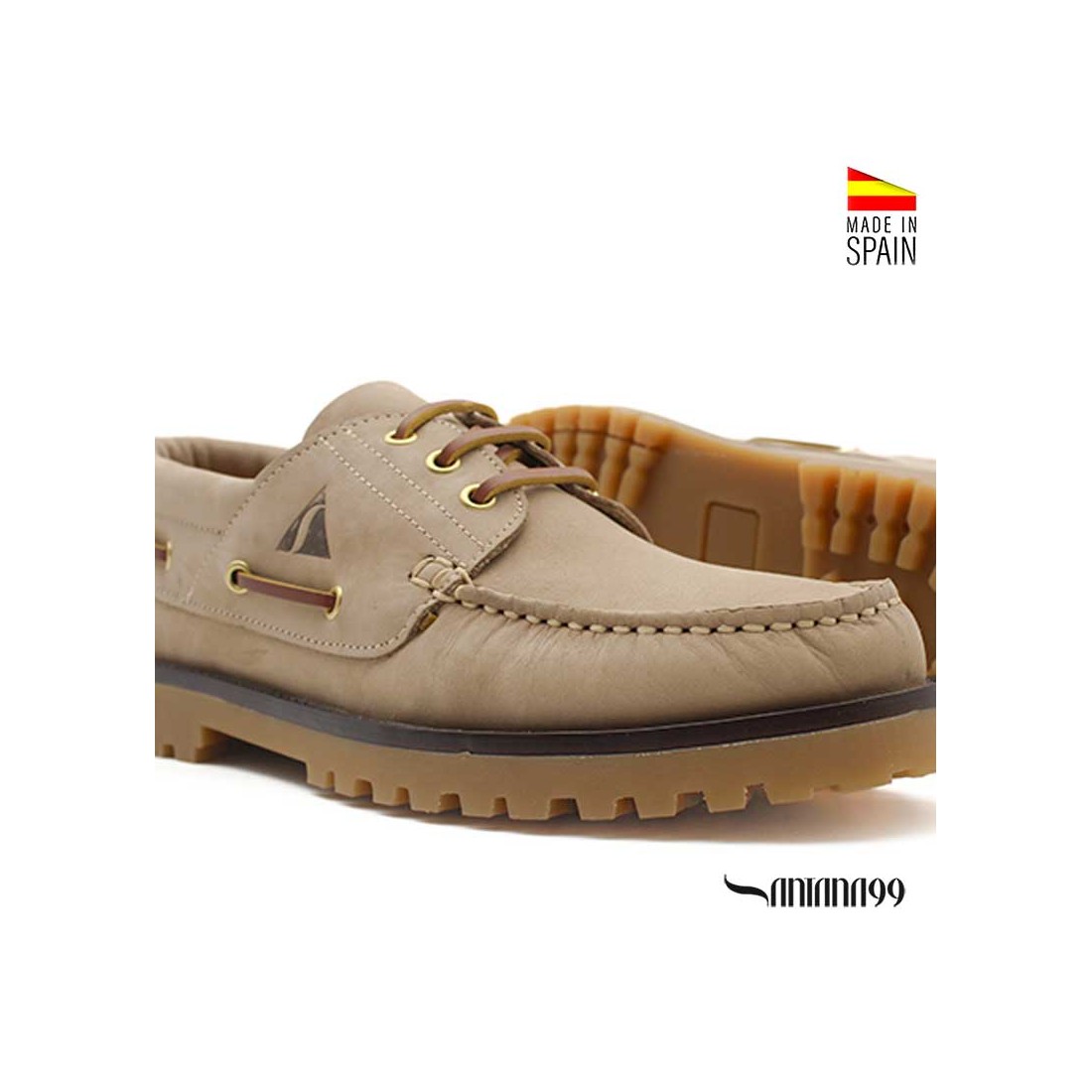 Su diseño incorpora cordones de cuero natural y el característico pespunte a mano del náutico, aportando autenticidad artesanal.