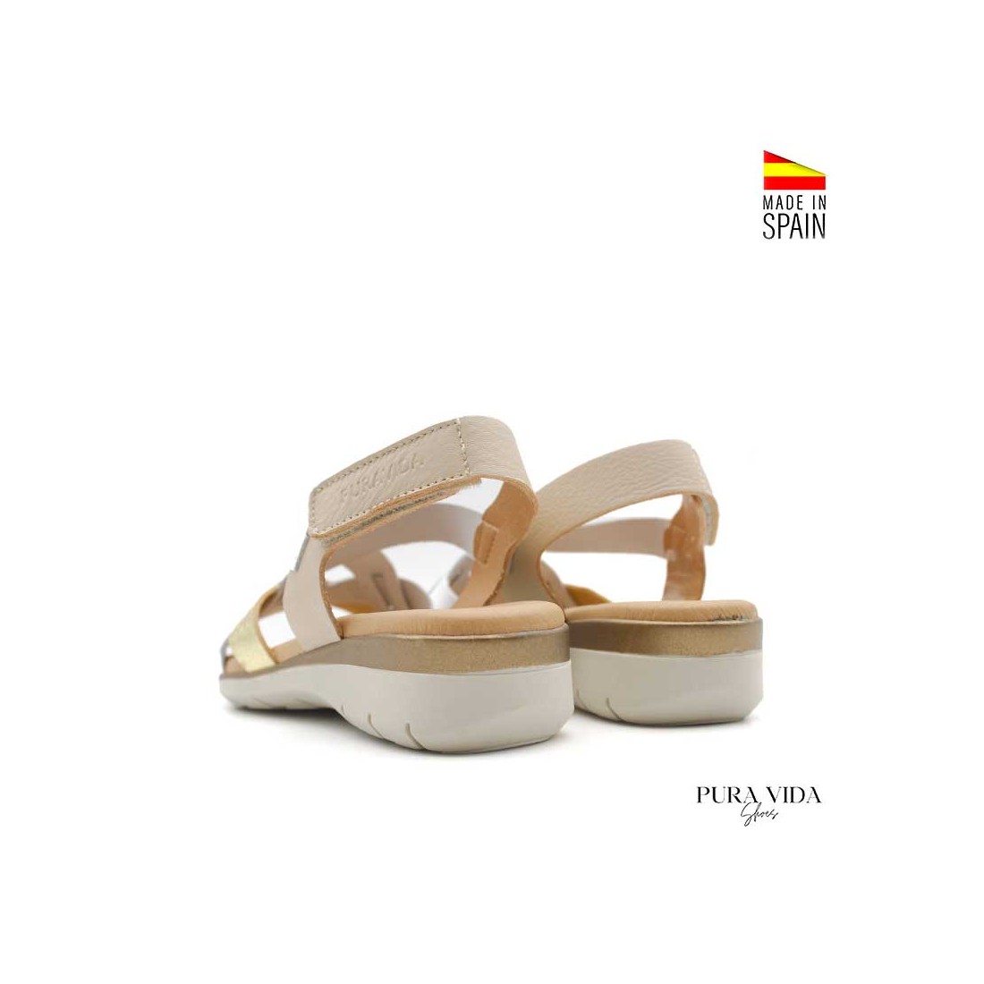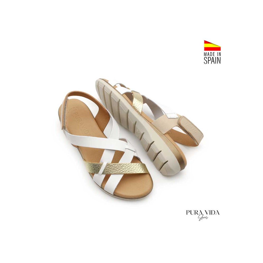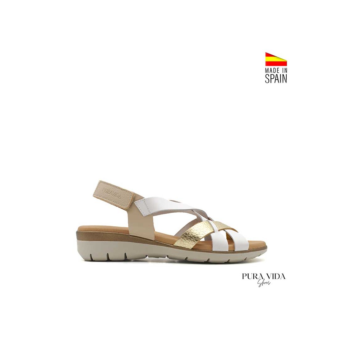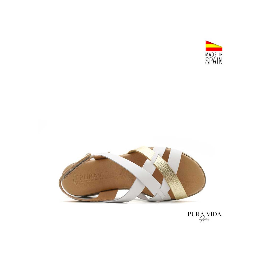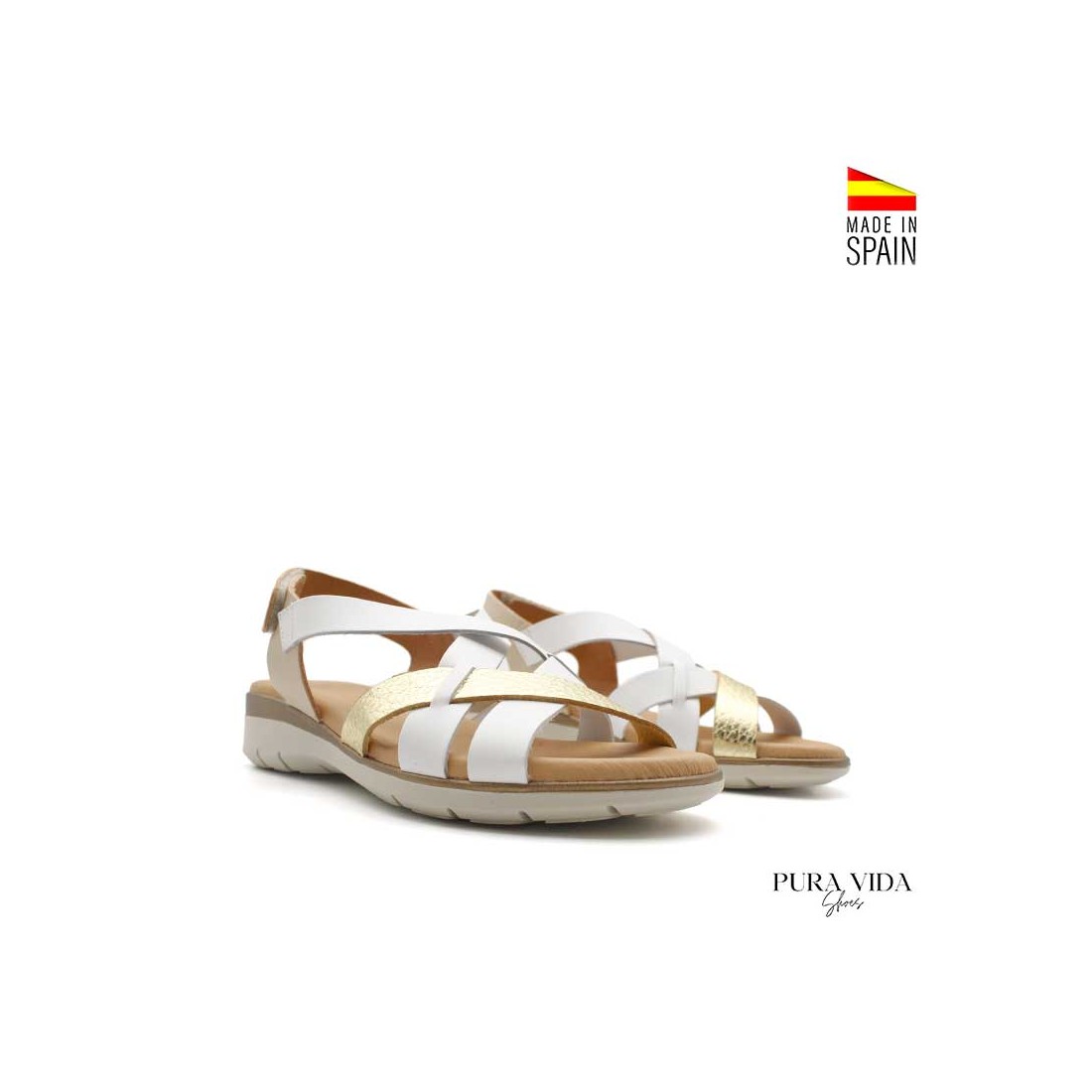 El contraste entre el blanco luminoso, el talón en tono beige y la tira dorada metalizada añade un toque chic sin perder naturalidad. Una sandalia pensada para mujeres que buscan versatilidad: perfecta tanto para el día a día como para ocasiones más especiales.