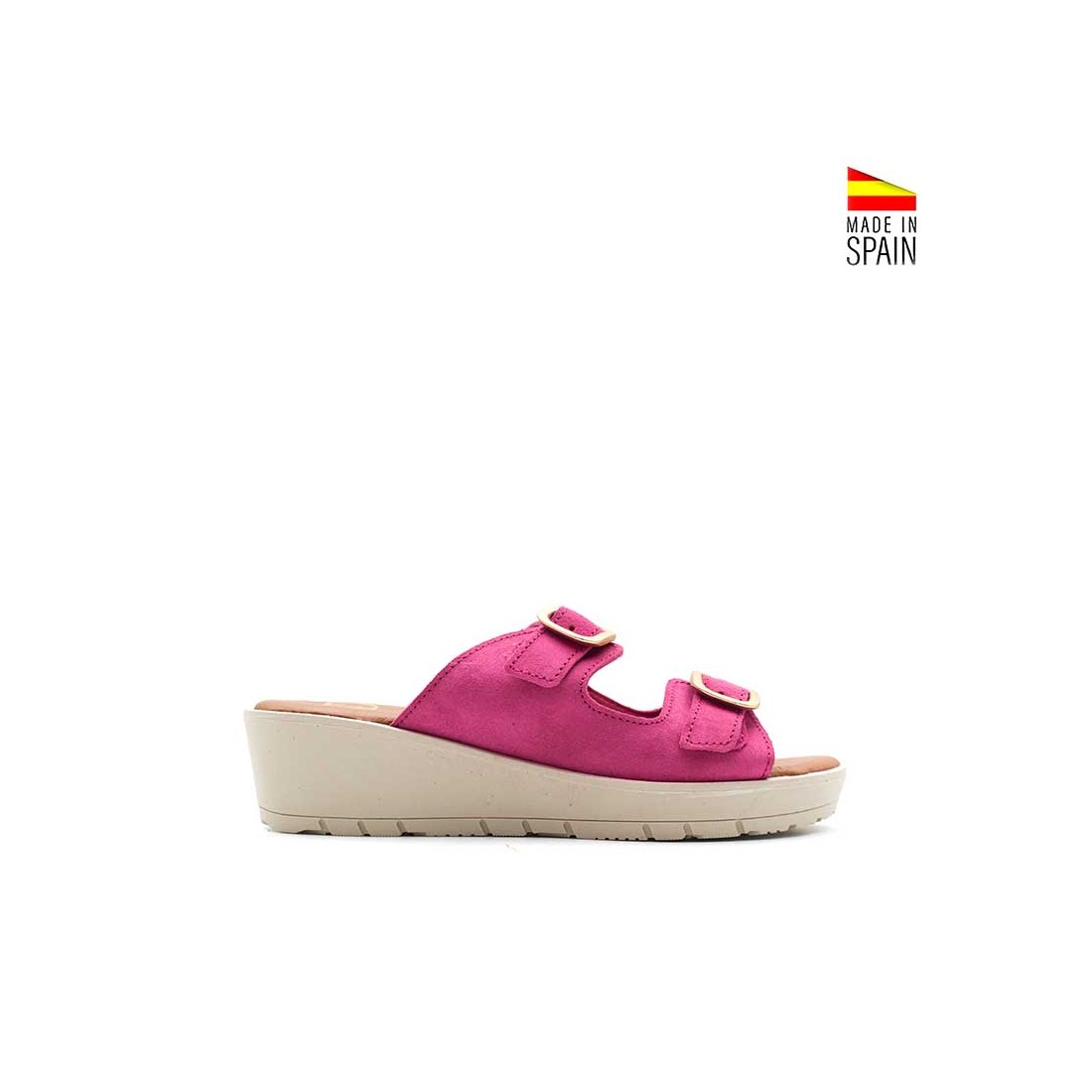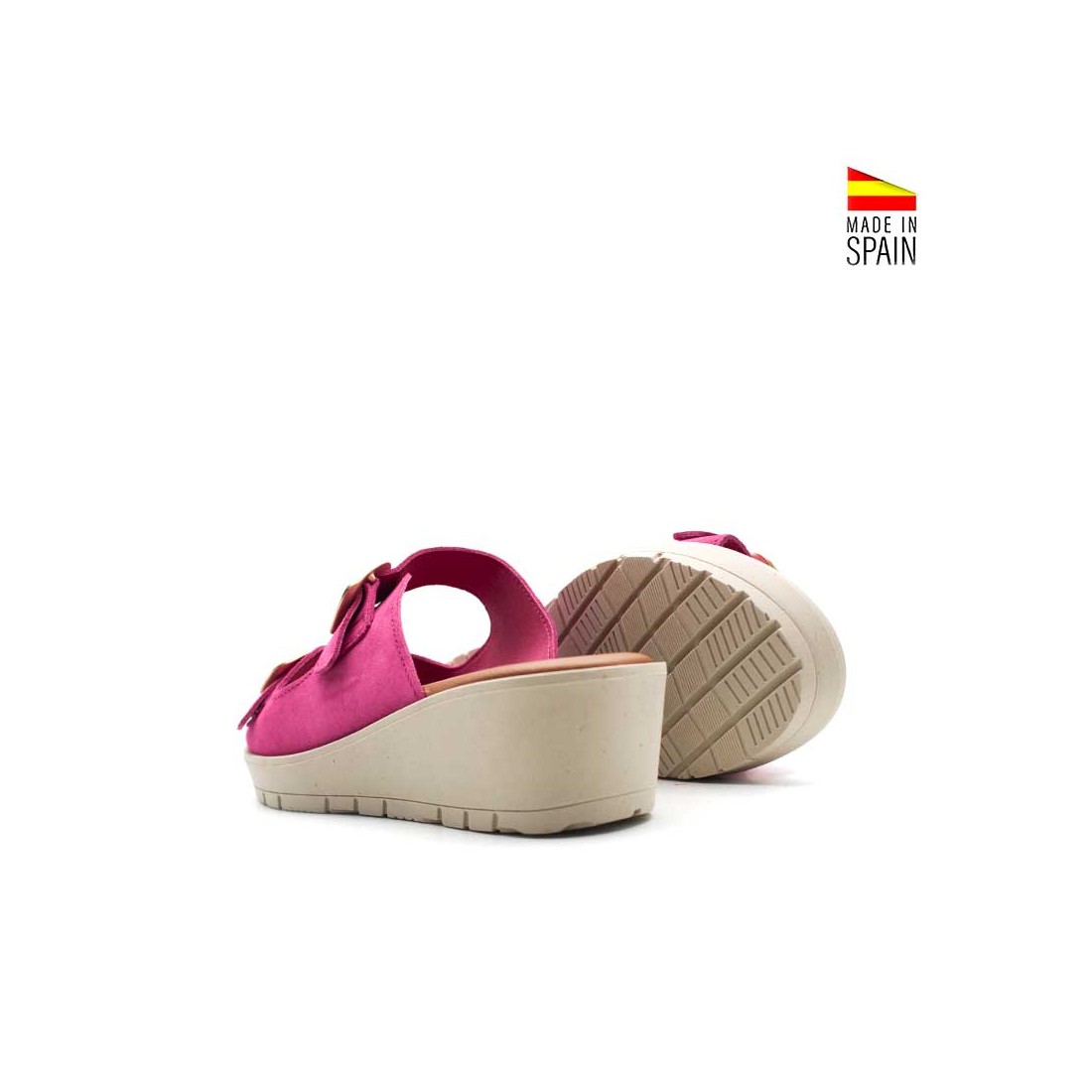 El diseño destalonado aporta ligereza visual y comodidad, mientras que las dos hebillas regulables permiten adaptar el ajuste al pie de forma sencilla. El serraje en tono fucsia añade textura y carácter, convirtiéndola en una sandalia que eleva cualquier look básico.