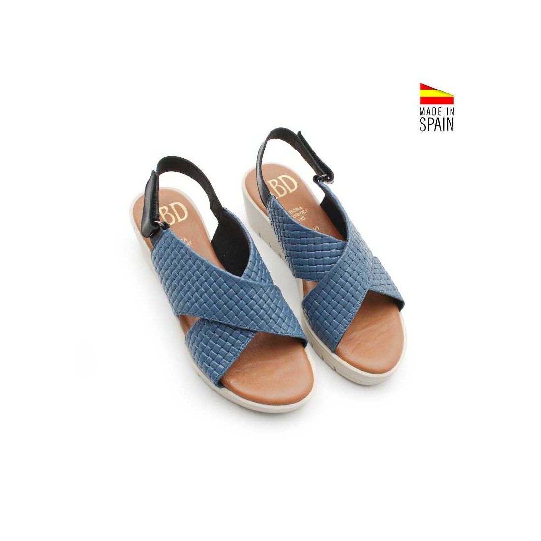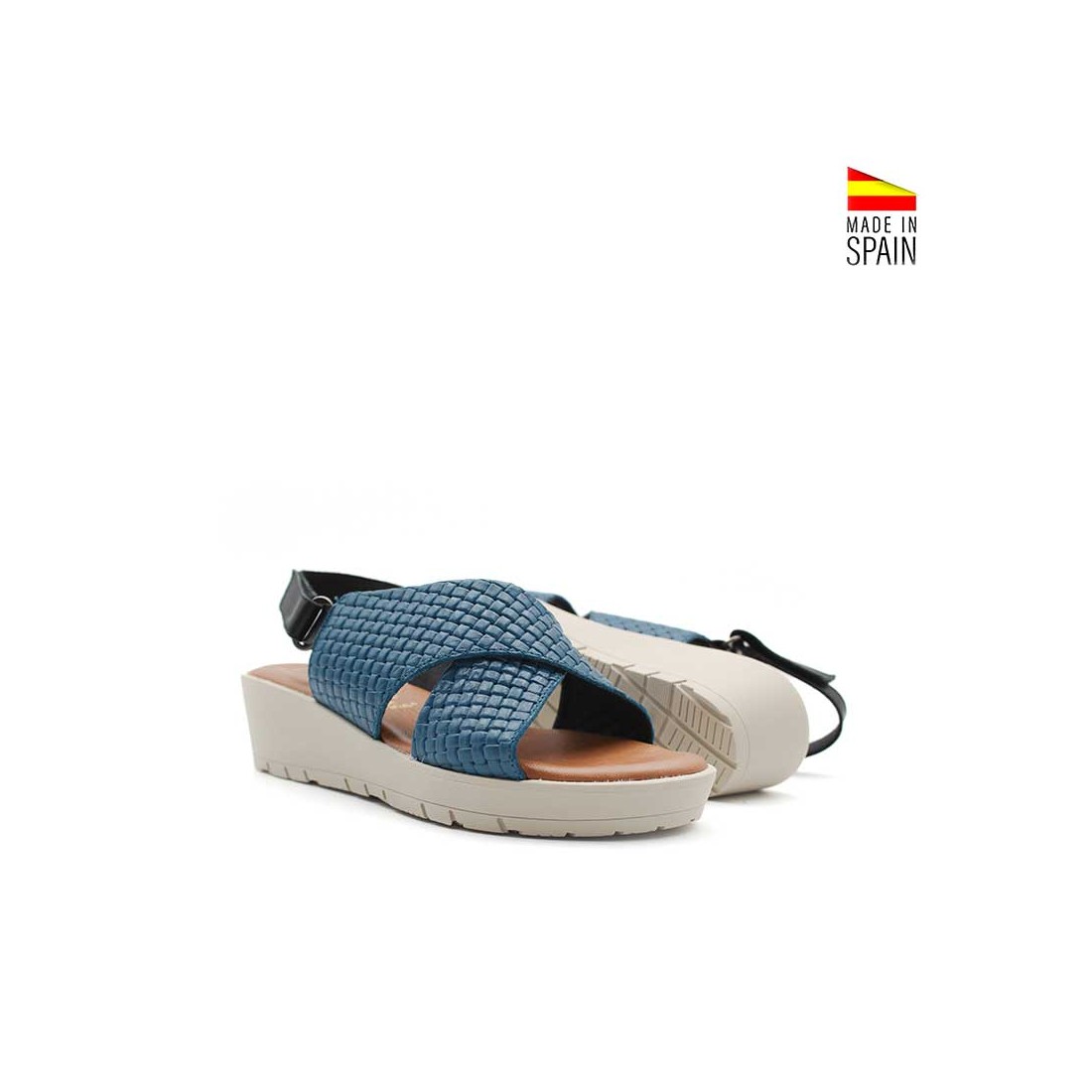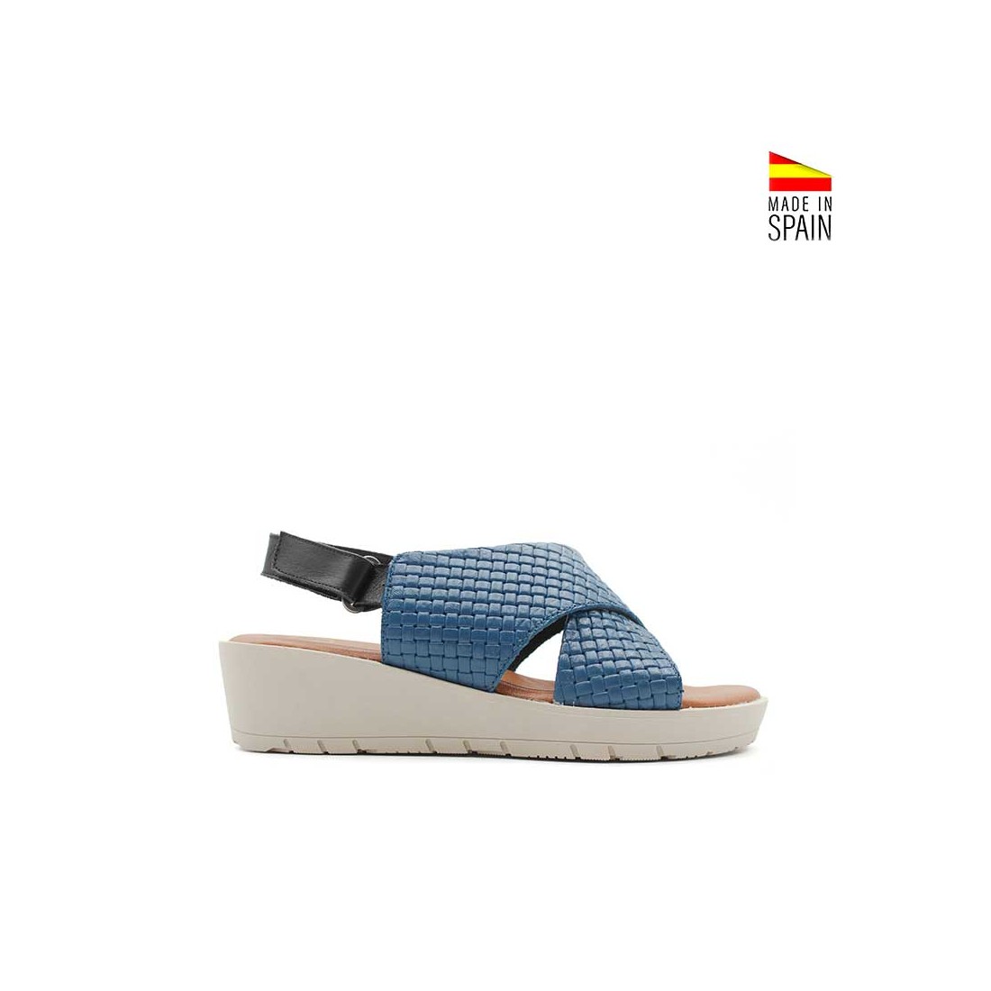 Estas cuñas azul marino mujer destacan por su diseño de pala cruzada en piel efecto trenzado, que envuelve el pie con suavidad y proporciona una sujeción natural.