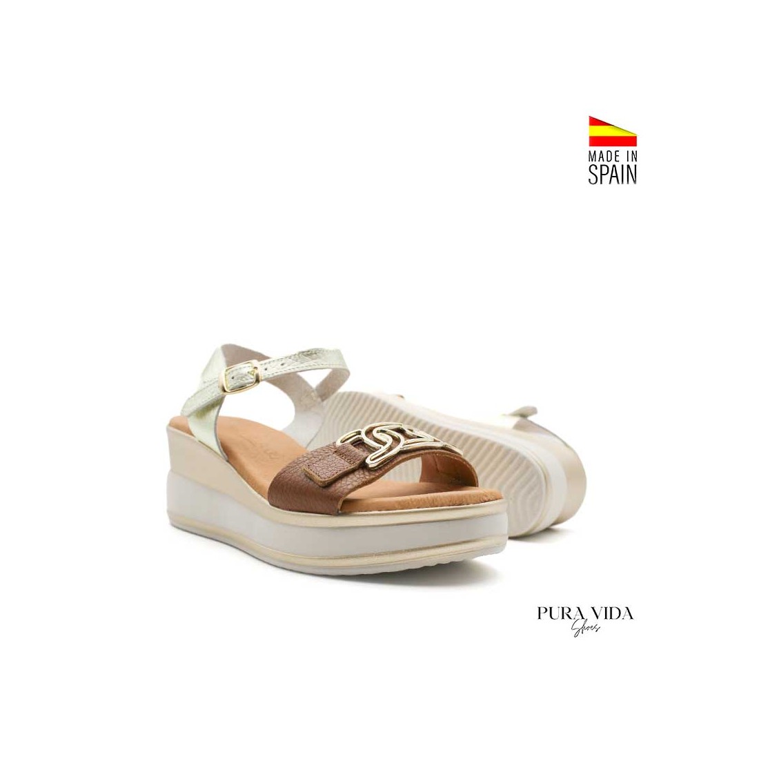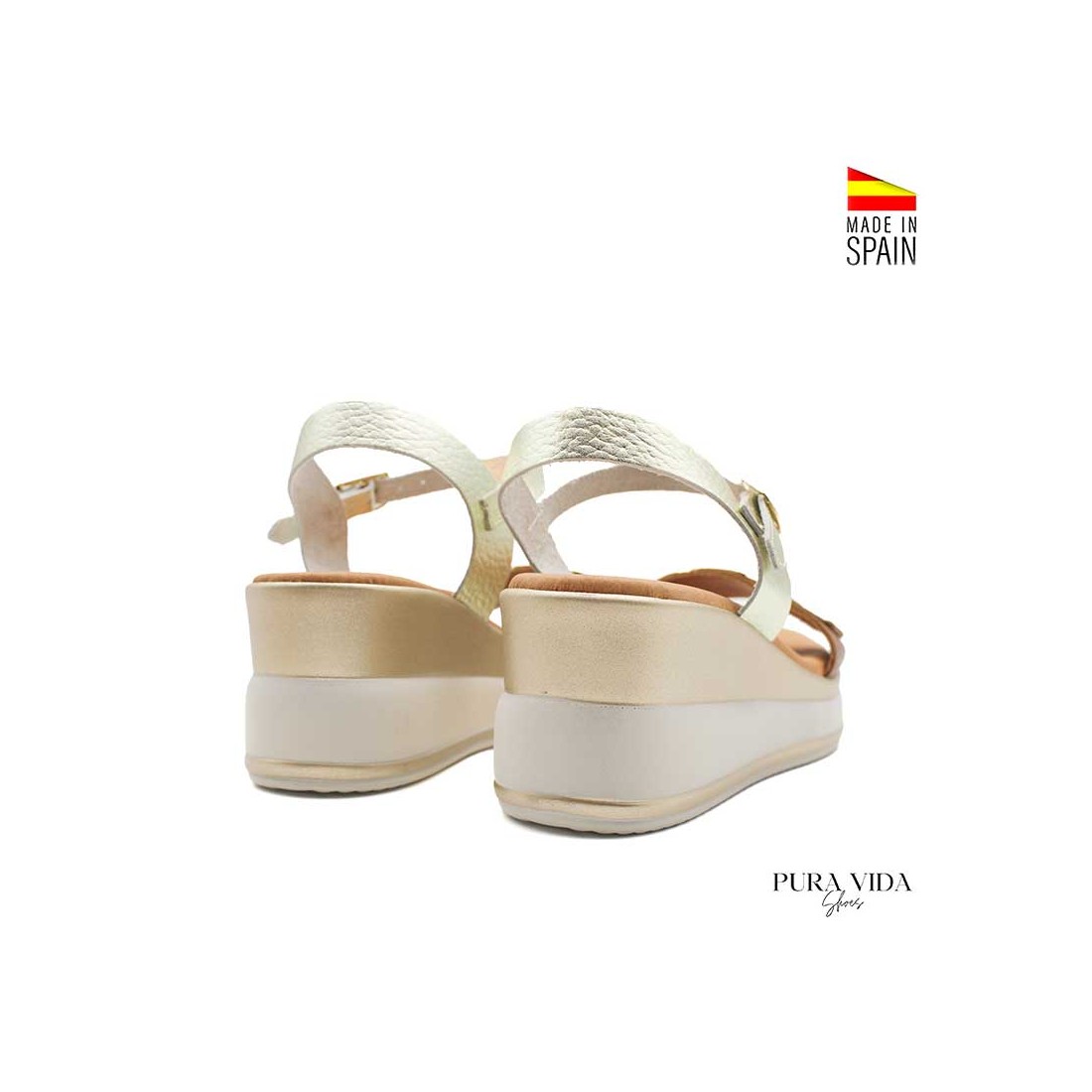 La cuña de 7 cm y la plataforma de 3 cm proporcionan una altura equilibrada que estiliza sin resultar excesiva. Además, cuenta con plantilla de piel acolchada con gel mejorando el confort y la pisada desde el primer paso.